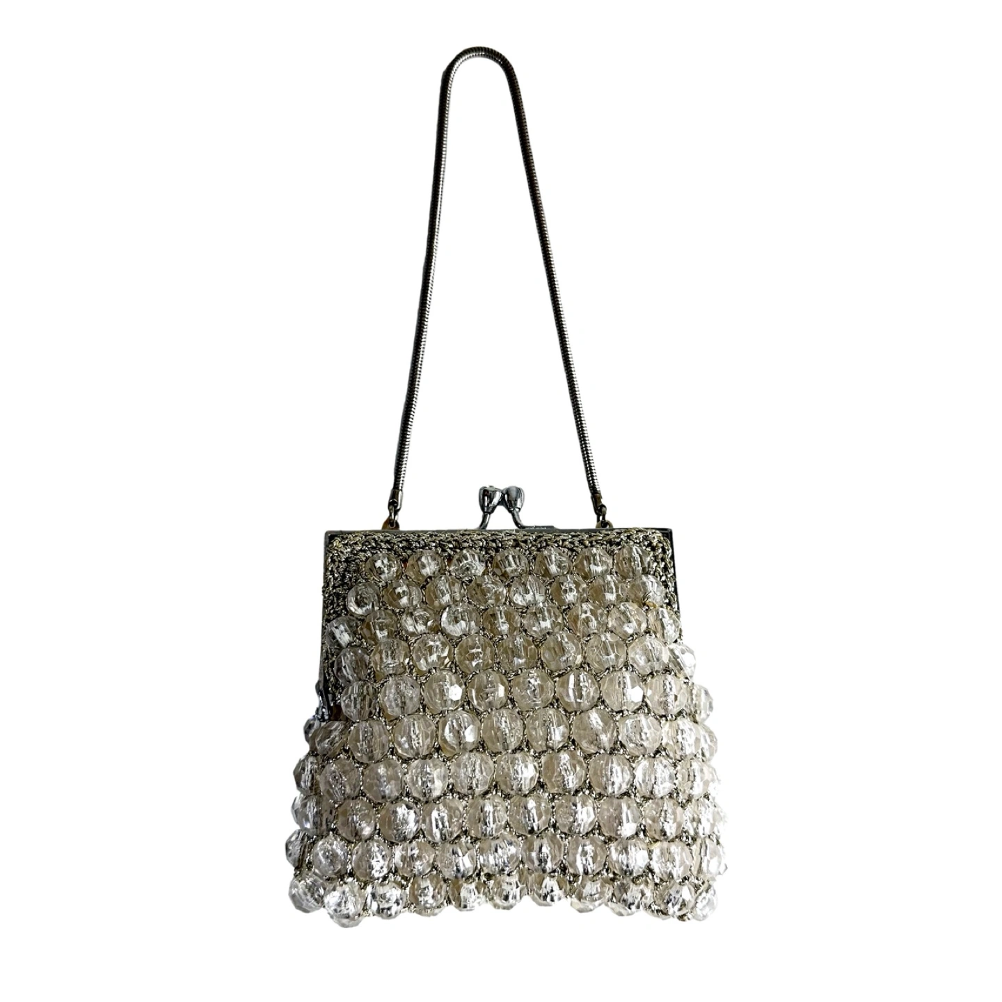 Selling a vintage beaded evening bag! It features clear beads and a silver-tone frame and chain. The interior is lined with a white satin-like material. It's perfect for a special occasion or adding a touch of vintage glamour to your outfit