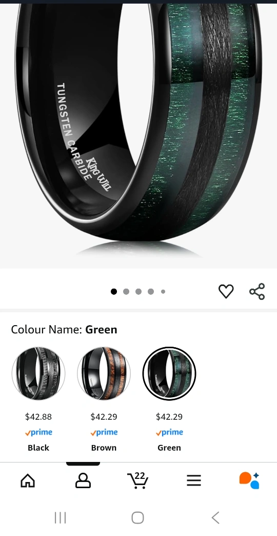 Here's a stylish King Will ring made of tungsten carbide. It features a sleek black band with a green inlay, adding a touch of colour. Originally priced at $42.29 plus tax. Brand New in box. Ordered the wrong size.