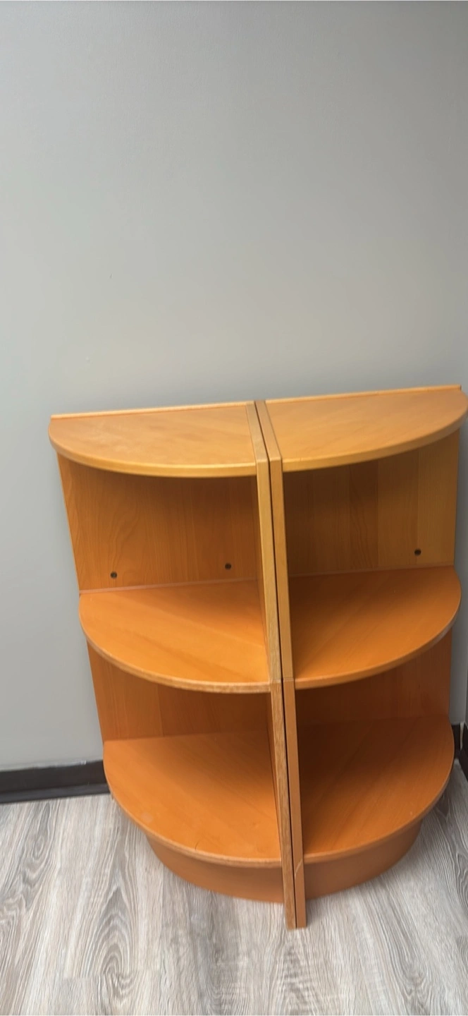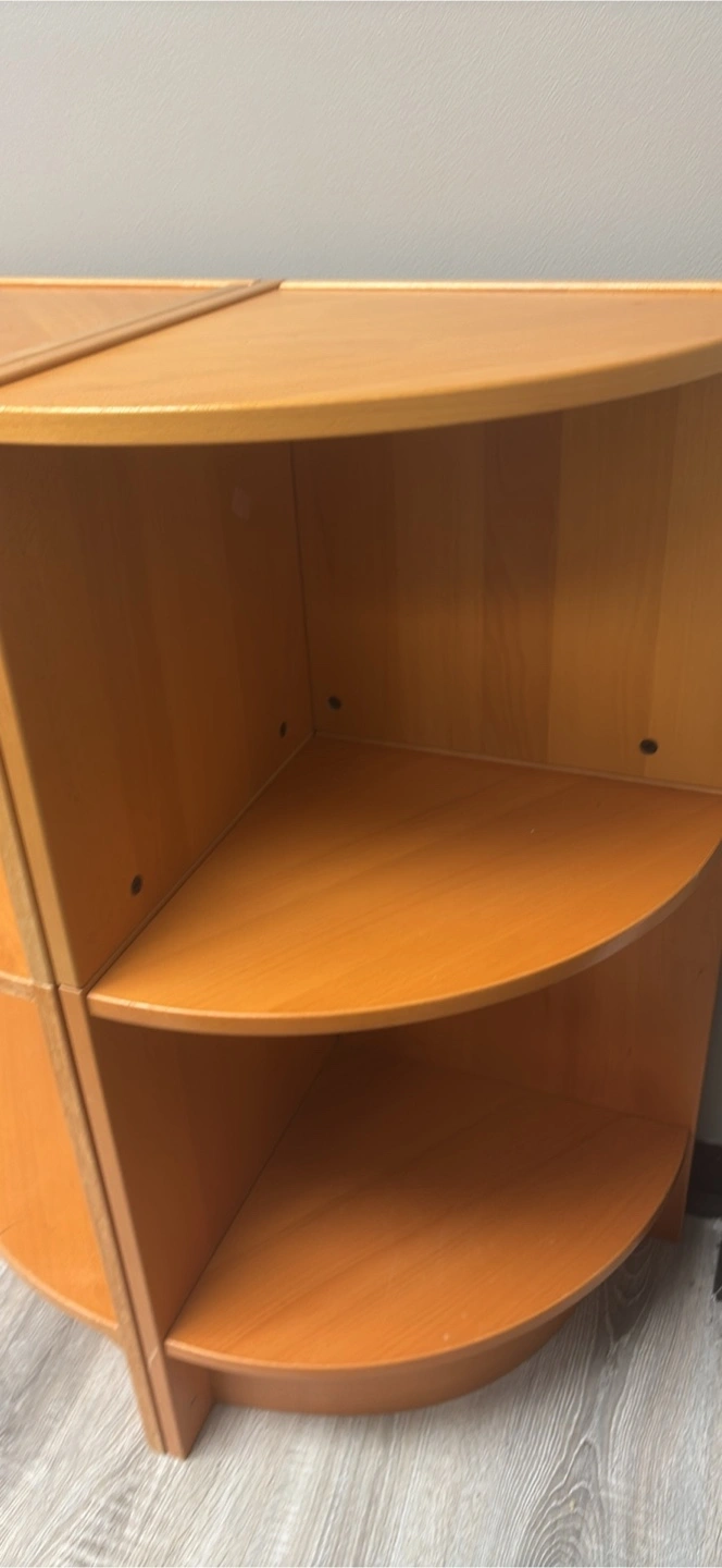 Here's a wooden corner shelf unit that could be a great addition to your home! It features a unique, curved design that adds a touch of style to any room. Its warm, wood finish complements various decor styles, making it a versatile storage solution