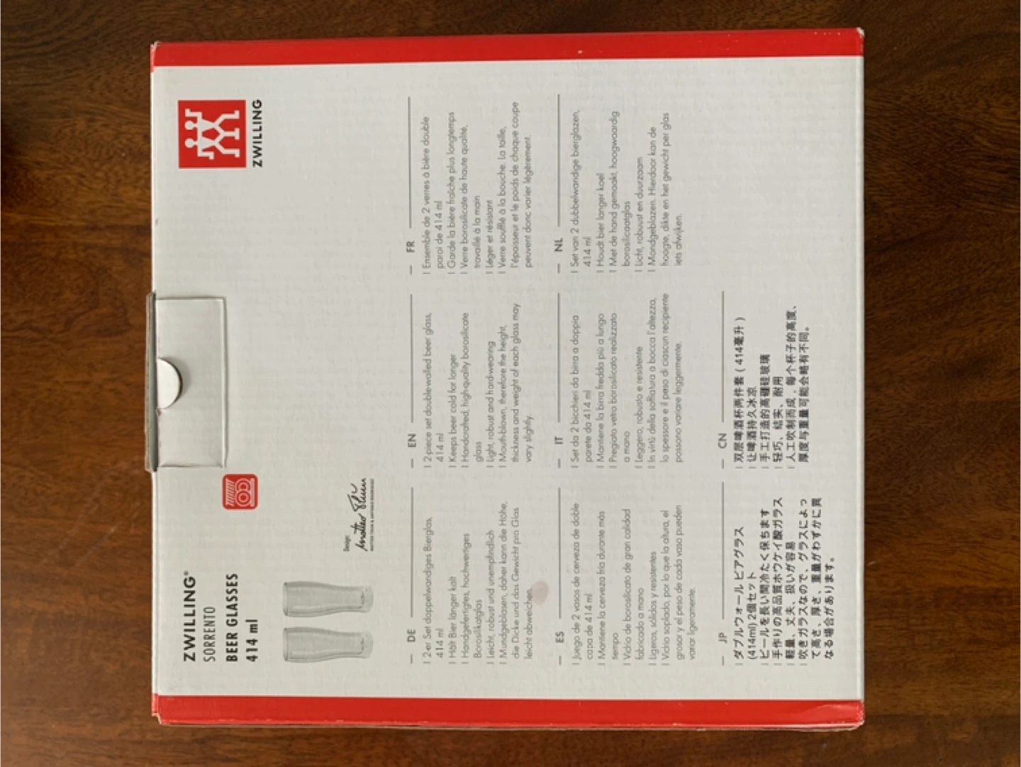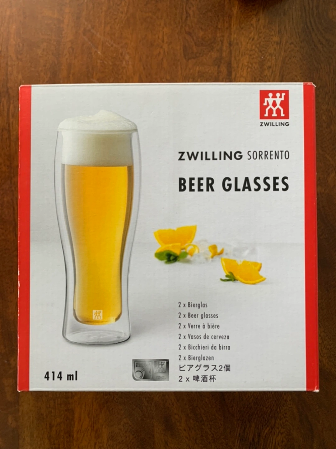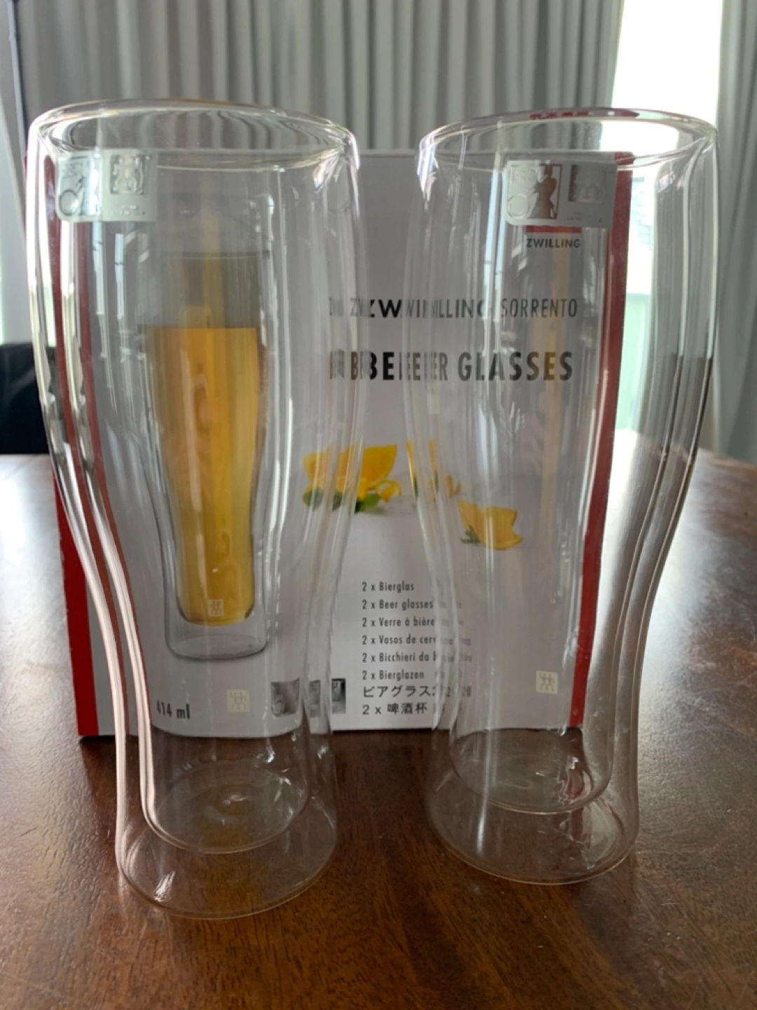 Selling a set of 2 Zwilling Sorrento beer glasses! These are double-walled glasses, perfect for keeping your beer cold for longer. They are 414 ml each and come in their original box