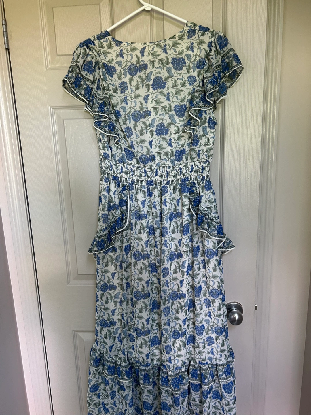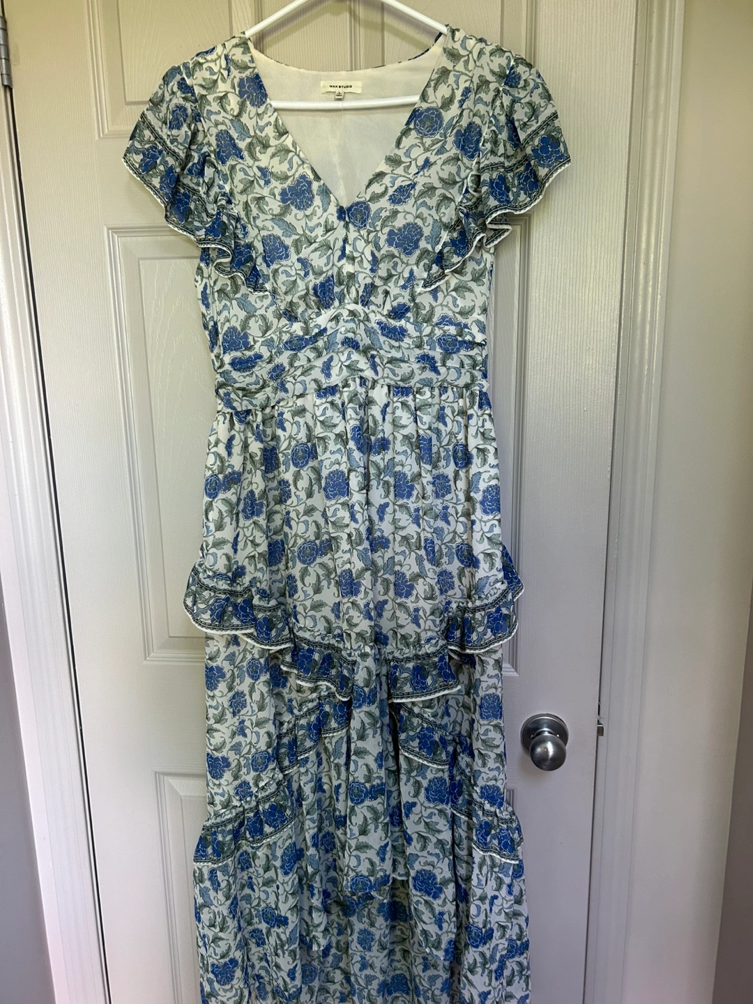 This is a beautiful floral print maxi dress from Max Studio. It's a size large and features a lovely blue and white pattern. Perfect for a summer day out or a special occasion!