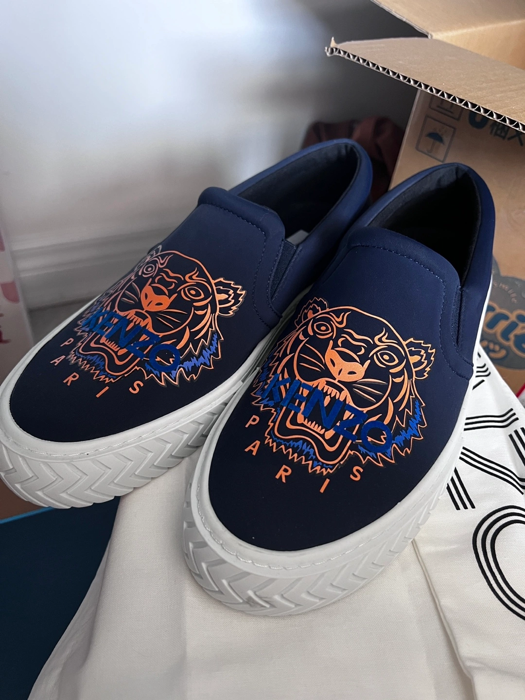 Selling a pair of Kenzo Paris Tiger slip-on sneakers in size 42 These stylish shoes feature the iconic Kenzo tiger design. They're in great condition and ready for a new home!