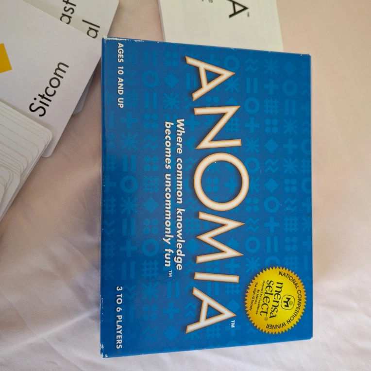 Anomia card game.It's a fun game where common knowledge becomes uncommonly fun. It's designed for 3 to 6 players, ages 10 and up. One round lasts about 30 minutes, and two rounds are suggested. It includes two Anomia decks, each with 92 playing cards and 8 wild cards