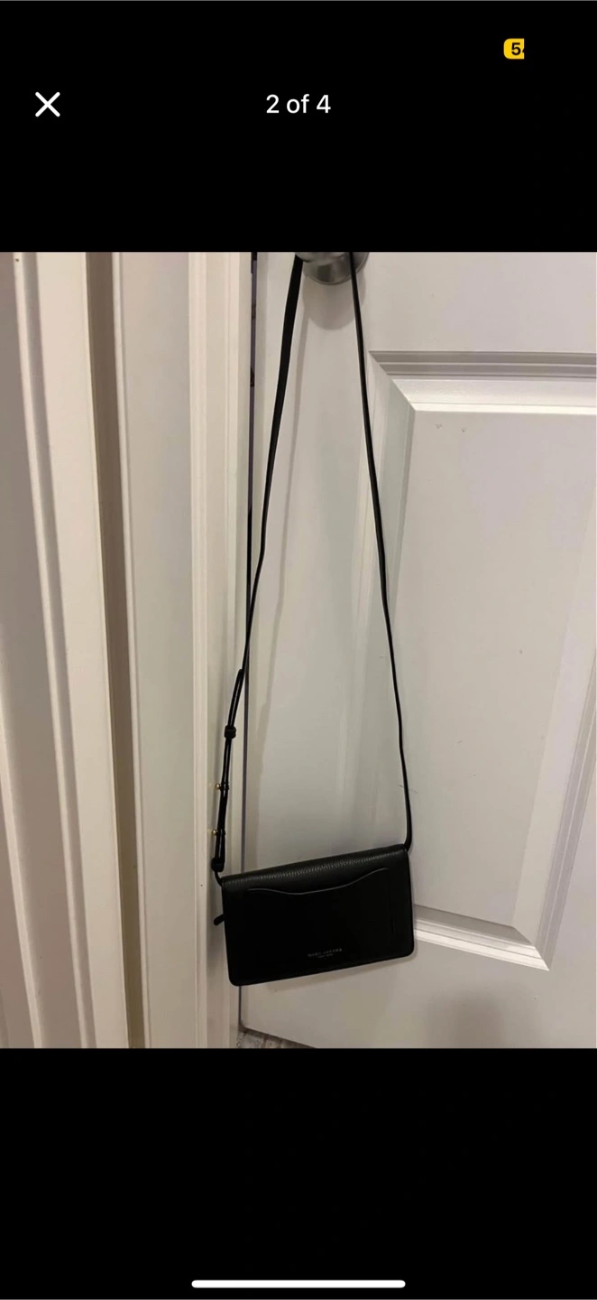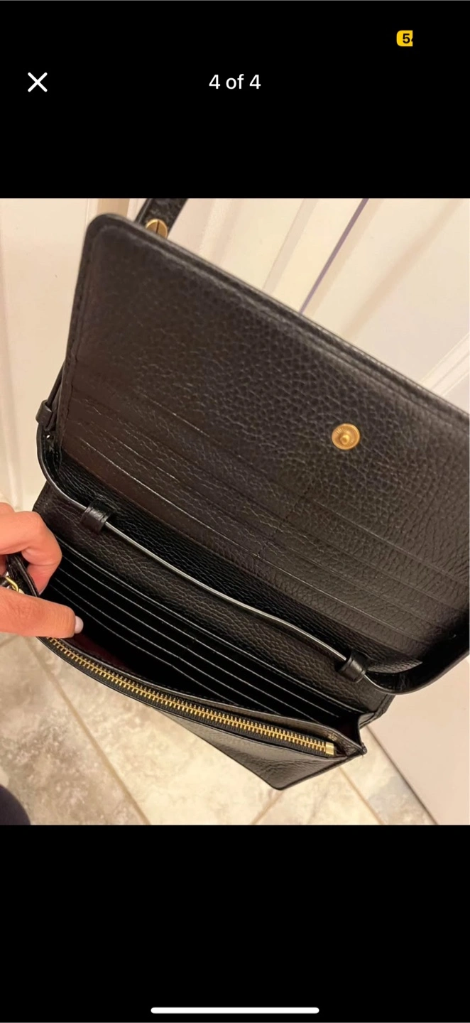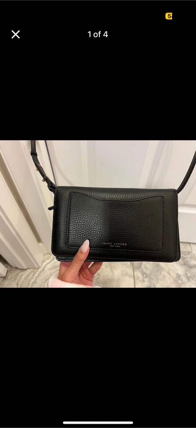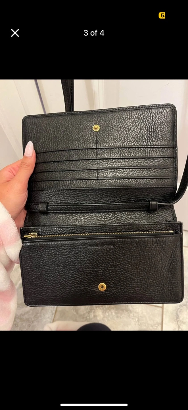 Selling a gently used Marc Jacobs crossbody wallet. It's in great condition and perfect for carrying your essentials. The wallet is made of black leather and has a zipper closure and several compartments inside.