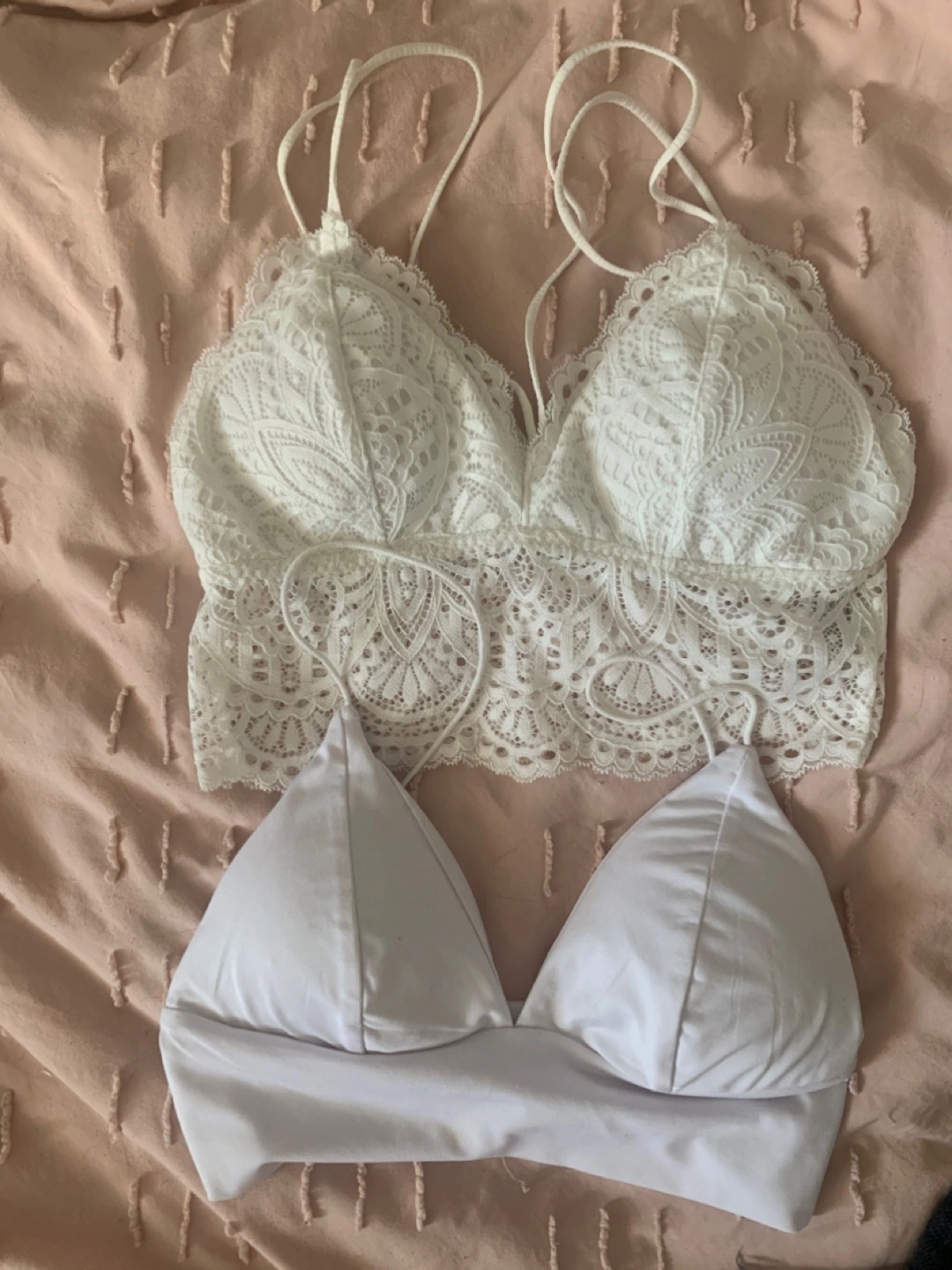 Selling a set of two cute bralettes! One is a white lace design, and the other is a plain white. Both are in great condition and ready for a new home!