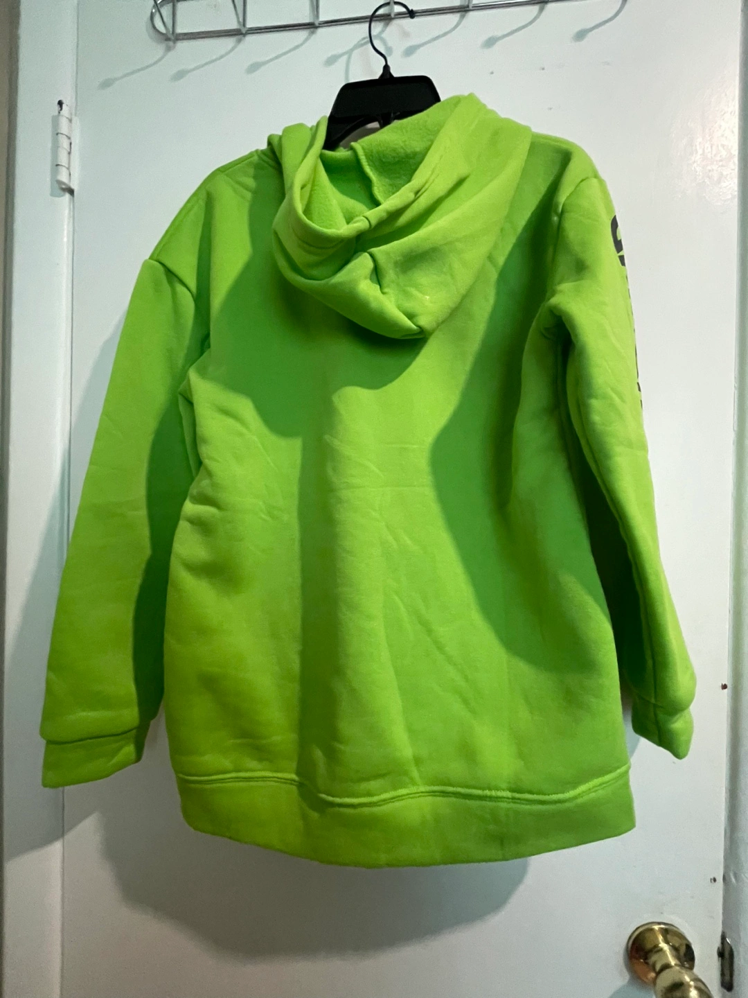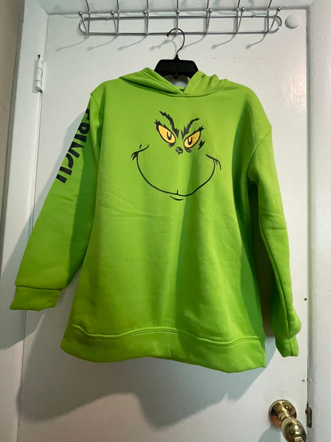 Selling a fun Grinch hoodie in a vibrant green! It features the Grinch's face on the front and the word "Grinch" down the sleeve. Perfect for the holidays or any Grinch fan. Originally bought for $41.99