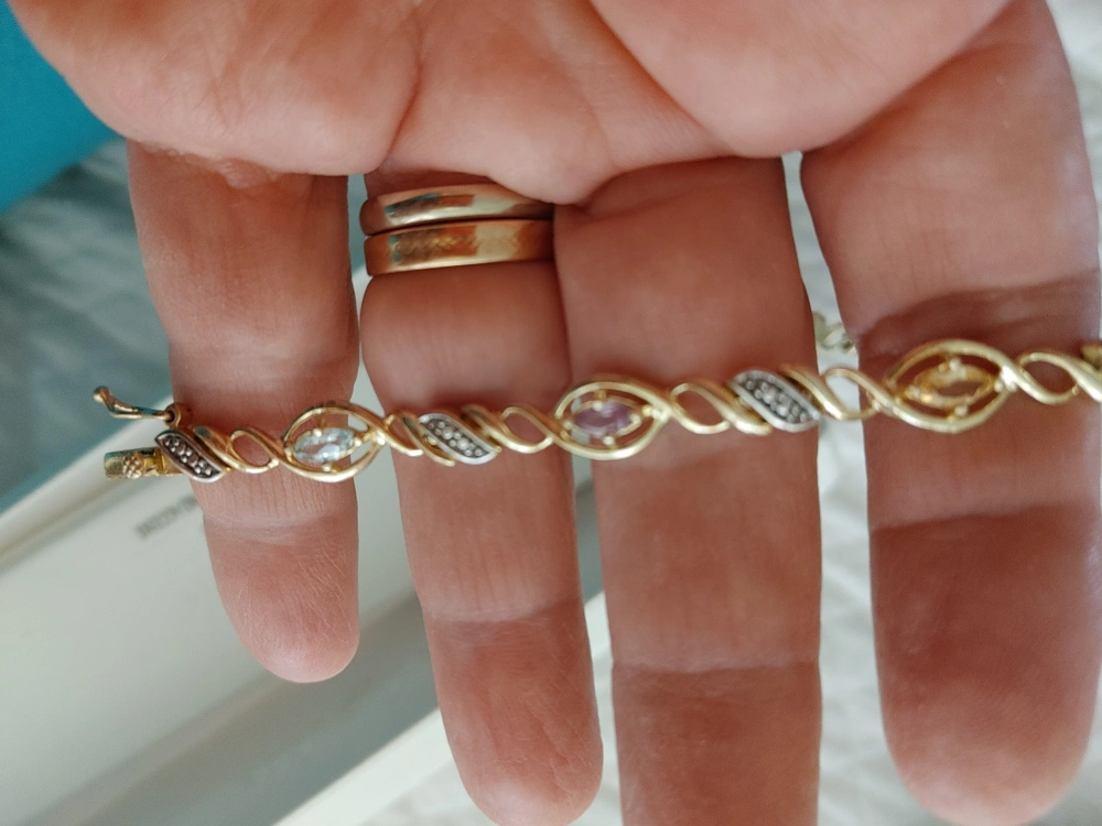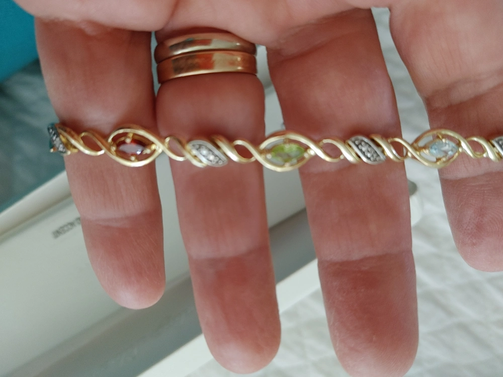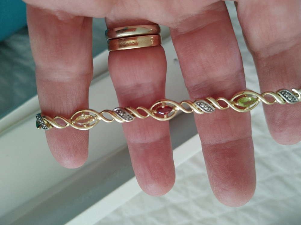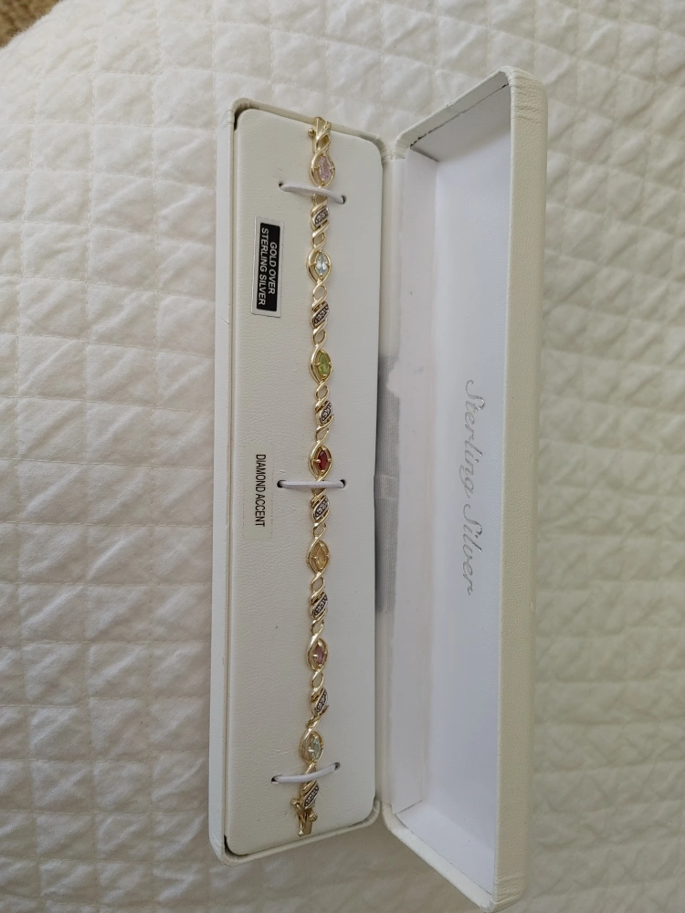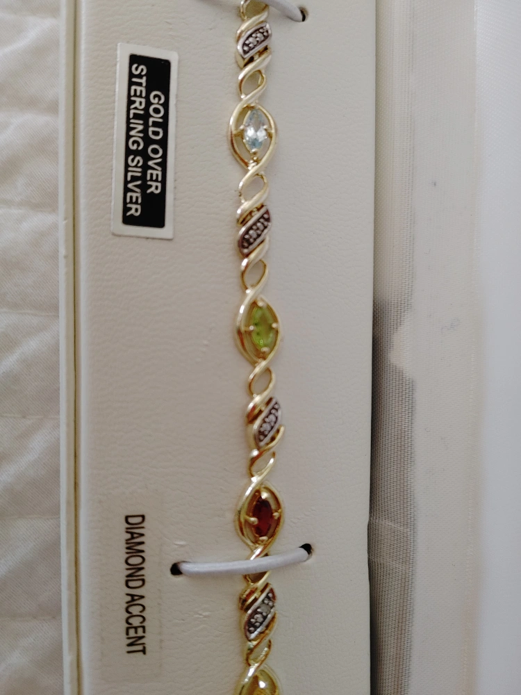 Here's a lovely gold over sterling silver bracelet with diamond accents and beautiful genuine stones as citrine, ruby, olivine, aquamarine, topaz and amethyst ! It's new and comes in its original box.