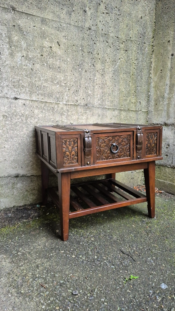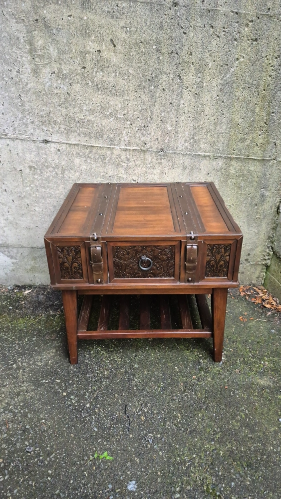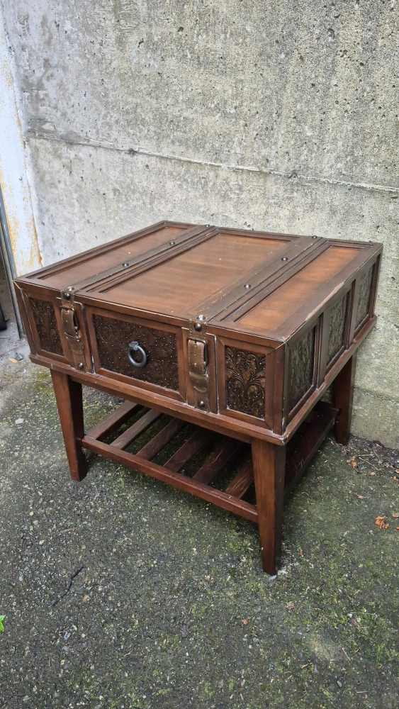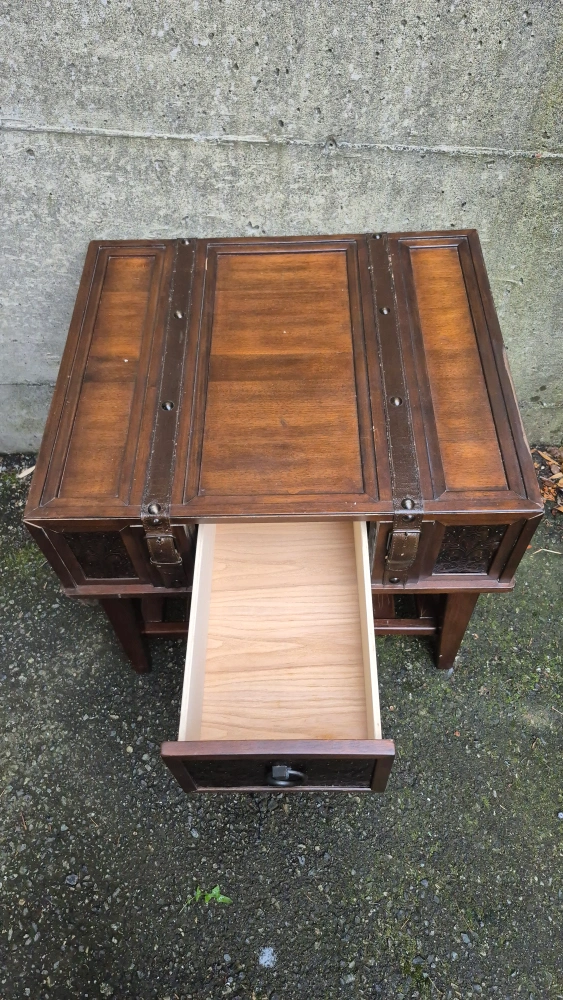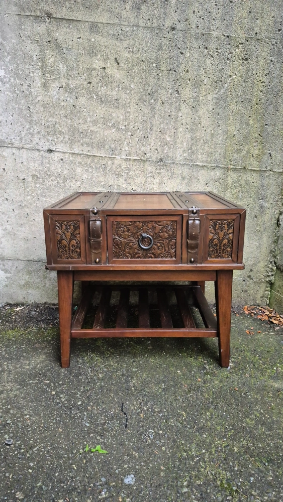 The McKenna Dark Wood accent table is the perfect addition to any space in your home. The rich brown finish is beautifully complemented with the use of inset stamped metal, and leather straps.Features include a pull-out drawer and slatted lower shelf.