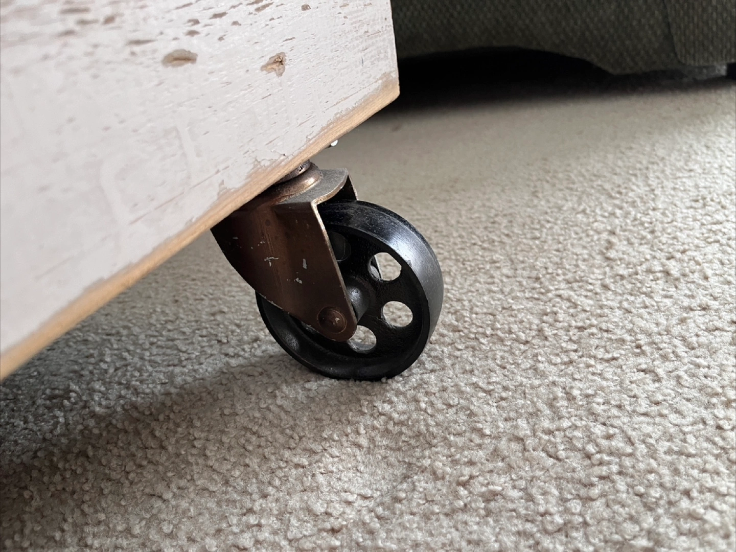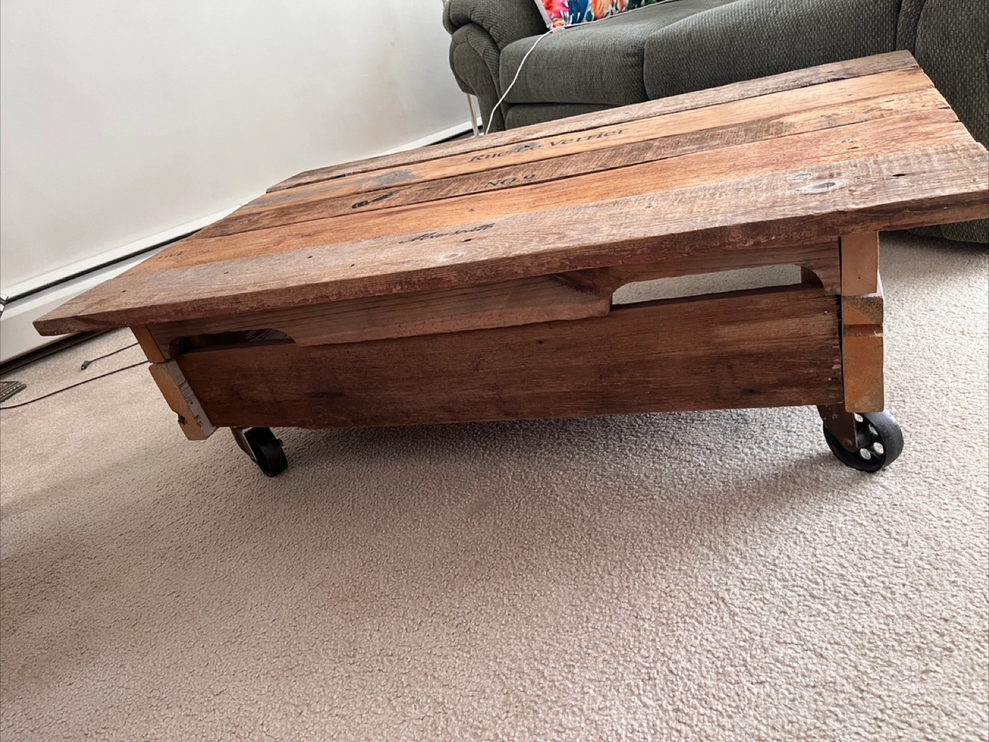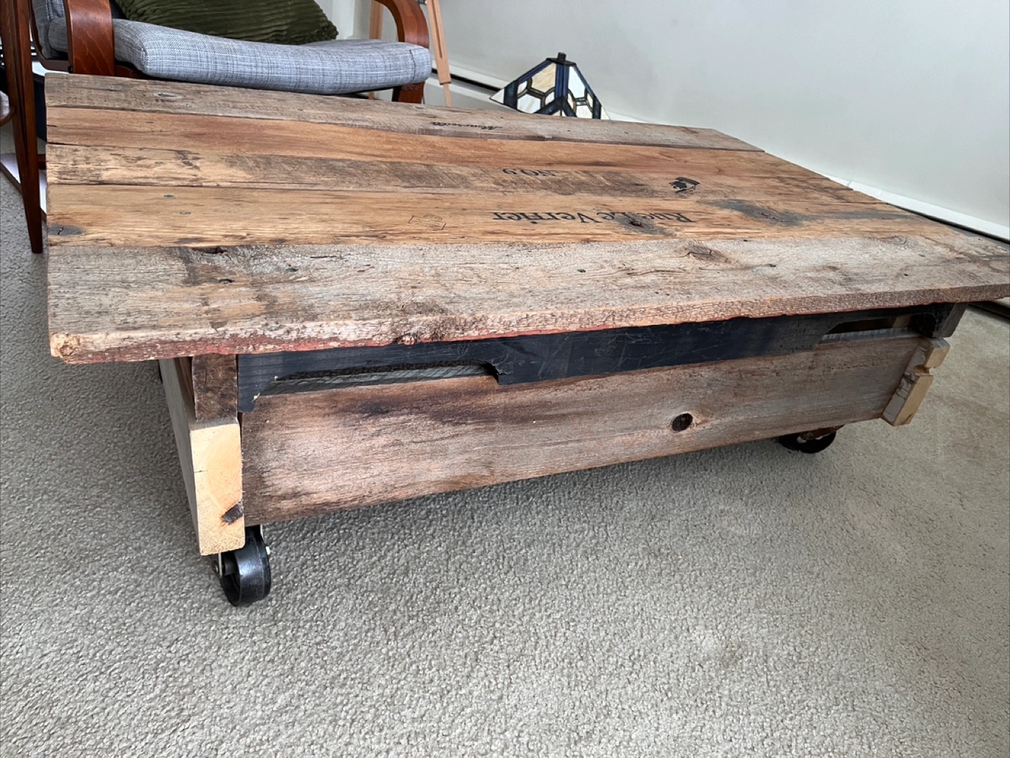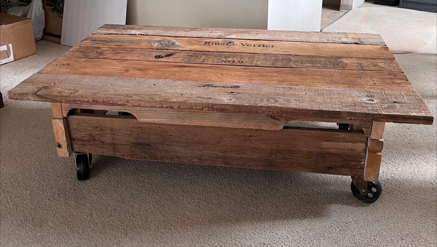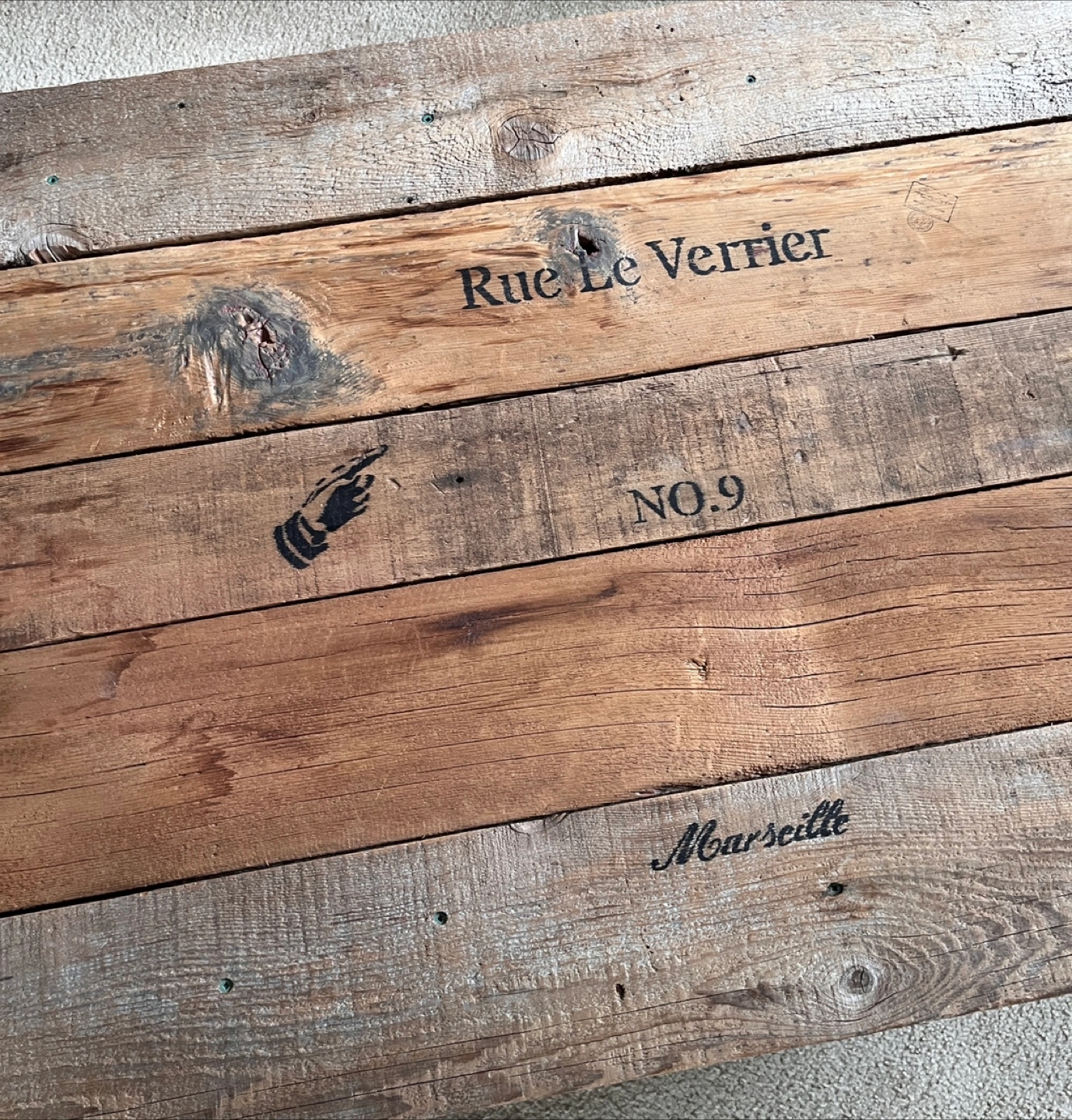Selling a rustic wooden coffee table with unique markings like 'Rue Le Verrier NO.9 Marseille'. It has a charming, aged look and is equipped with wheels for easy movement. The base has a distressed white paint finish, adding to its vintage appeal