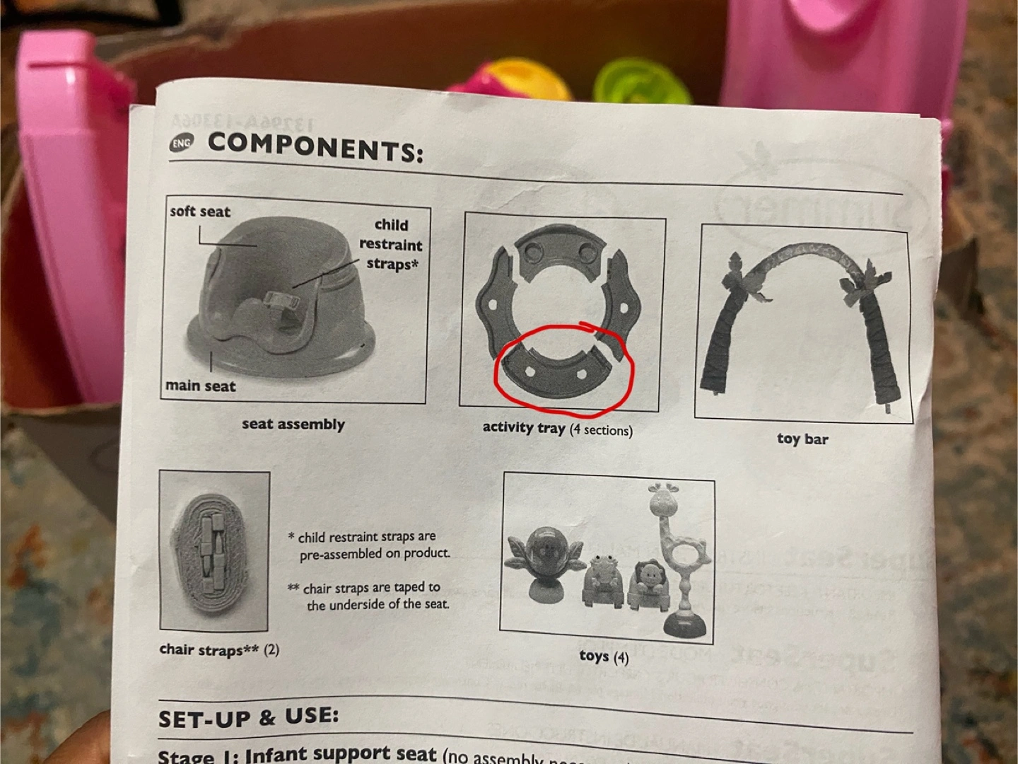 The seat comes with a soft foam support and an activity tray with four (missing one) sections. Also included are two chair straps and four toys for added fun. The original box is included!