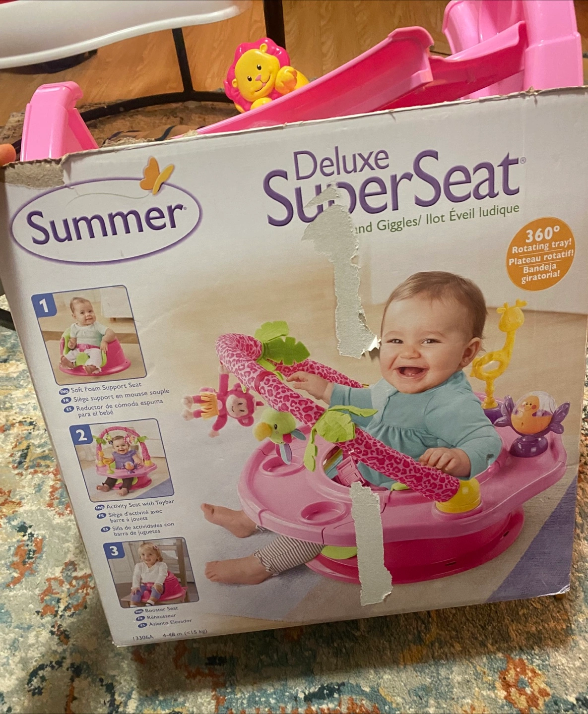 Selling a Summer Infant 3-Stage SuperSeat Deluxe Giggles Island in great condition! It functions as a positioner, activity seat, and booster for your little one.