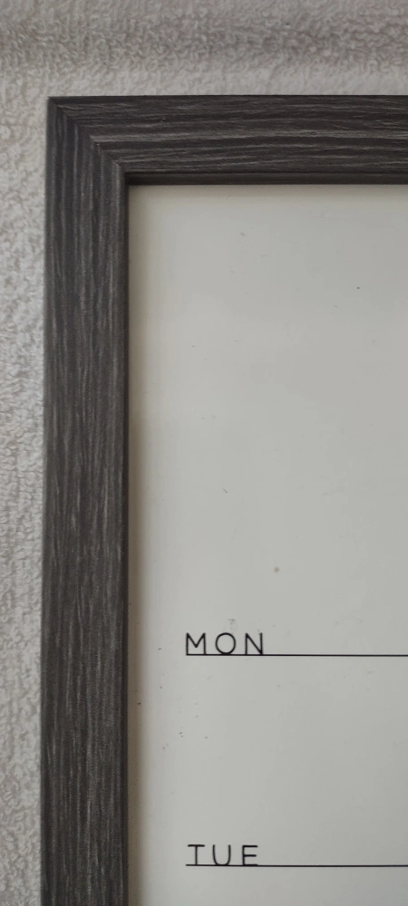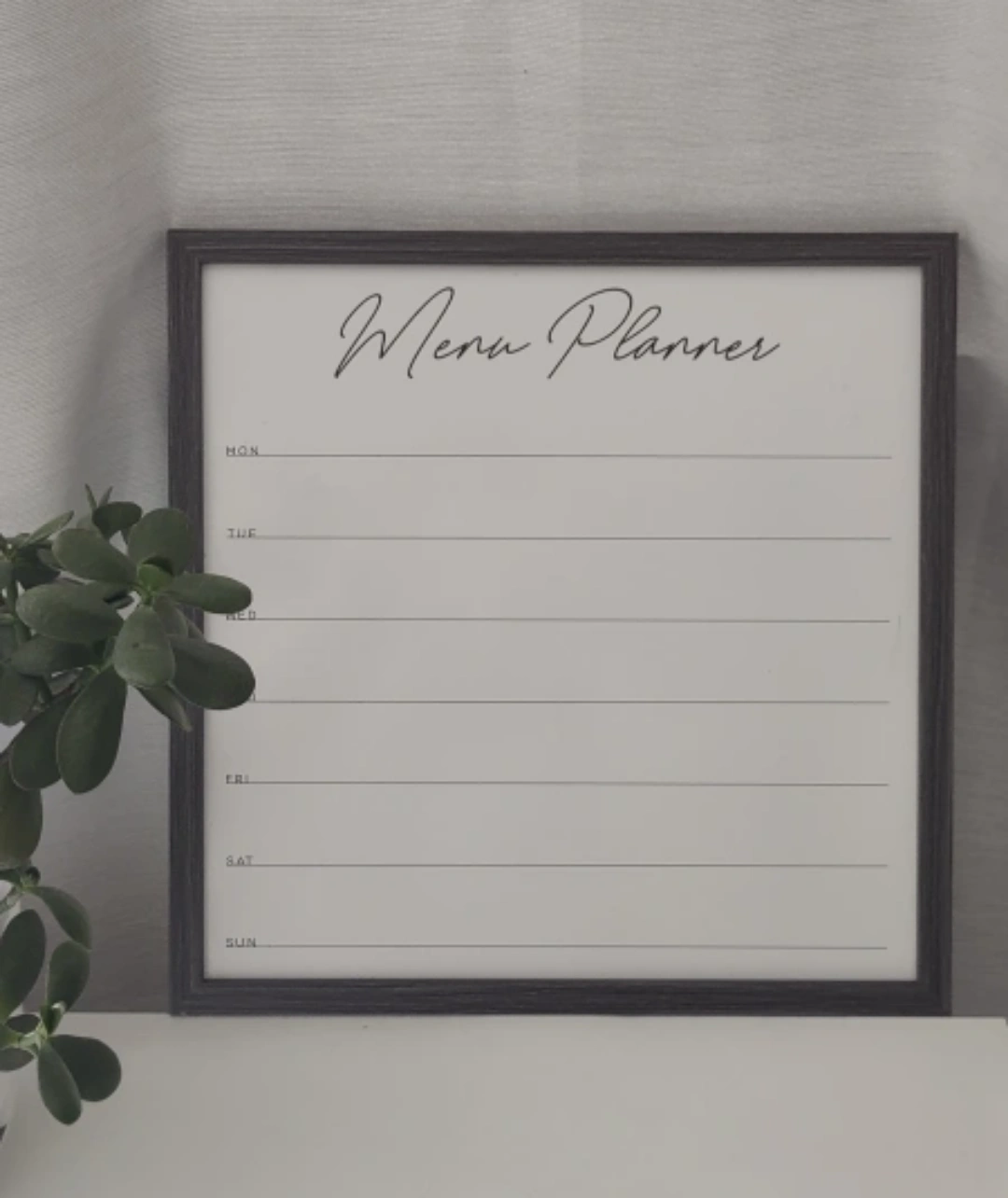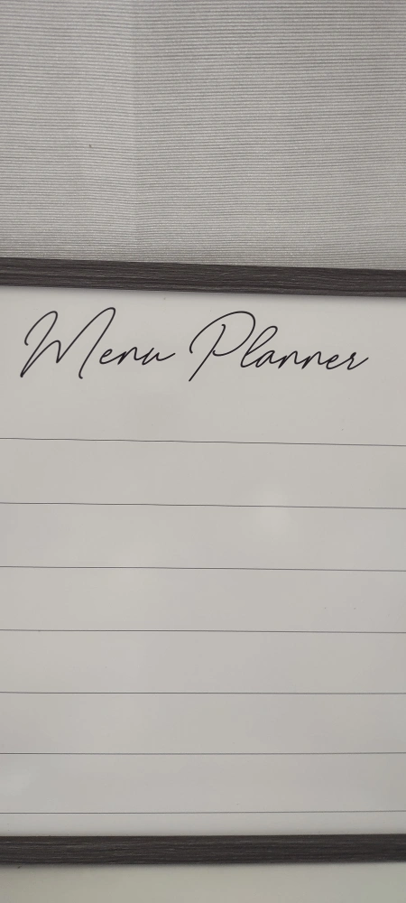 It has a dark gray frame and can be used as a menu planner, calendar, or bulletin board. It's in great condition. likes new and would be a nice addition to any home or office.