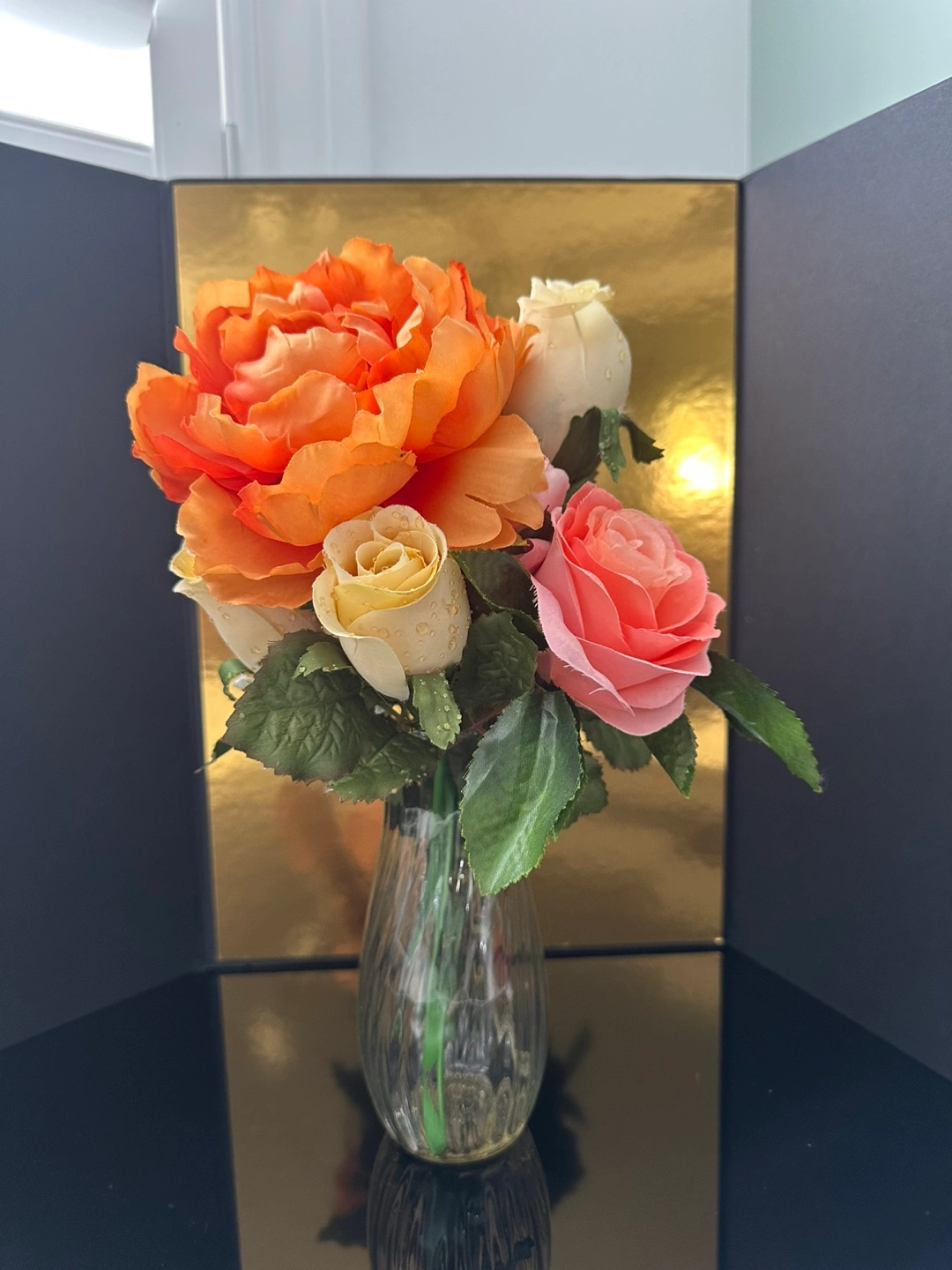 A lovely artificial flower arrangement featuring a mix of orange, pink, and white roses and peonies in a clear glass vase. Perfect for adding a touch of colour to any room!