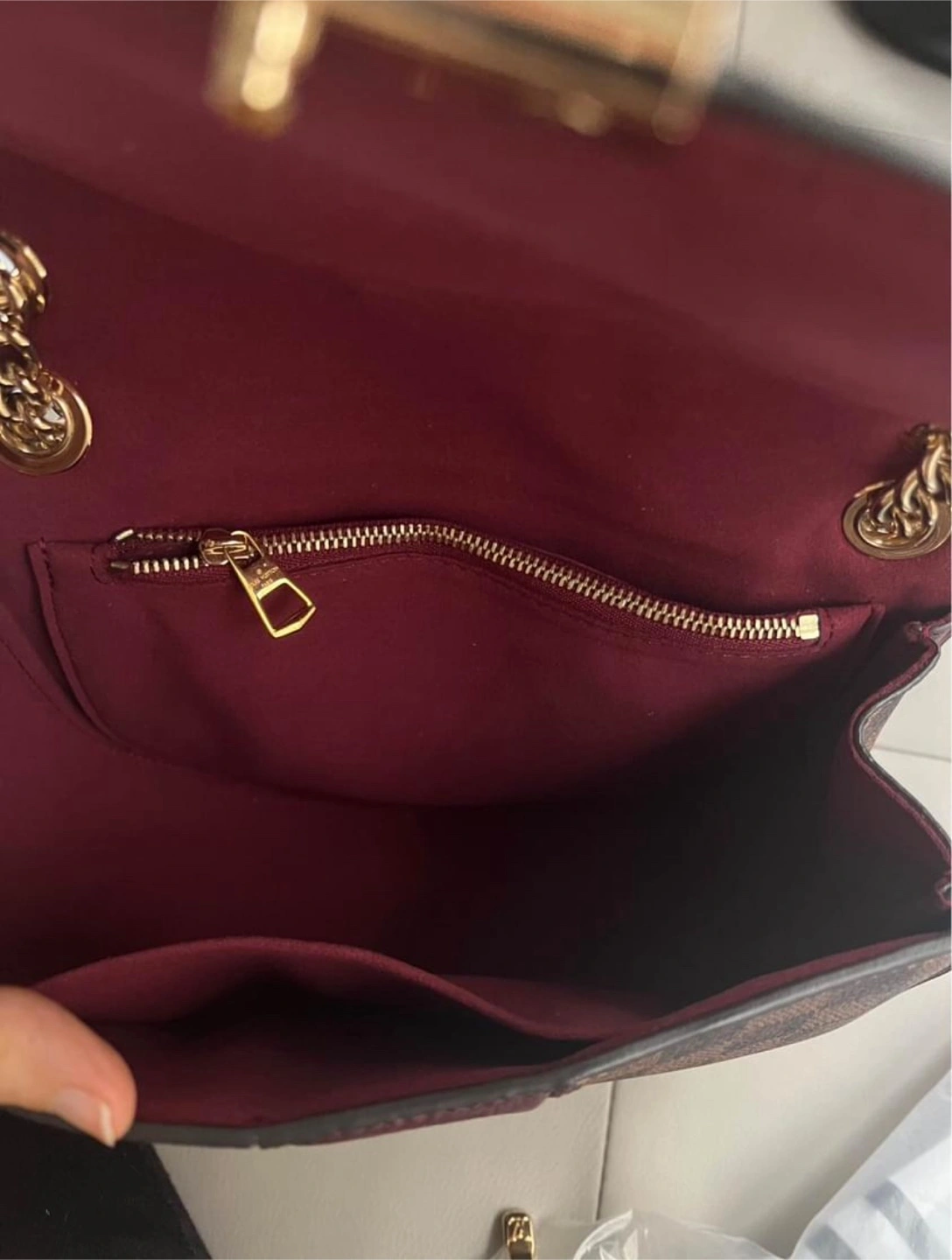 Comes with golden sliding chain for shoulder carry or cross body.
