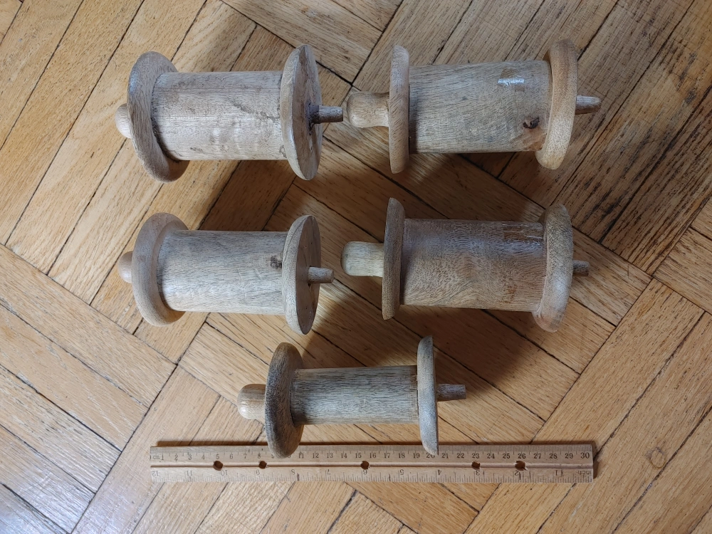Selling a set of five wooden spools. They vary in size, as you can see from the ruler in the photo. Perfect for crafting or decorative purposes!