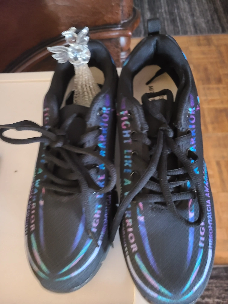 Selling these sneakers with a Fibromyalgia Awareness design. They feature the text 'FIGHT LIKE A WARRIOR FIBROMYALGIA AWARENESS' and an image of a wolf. Great for showing your support or raising awareness!