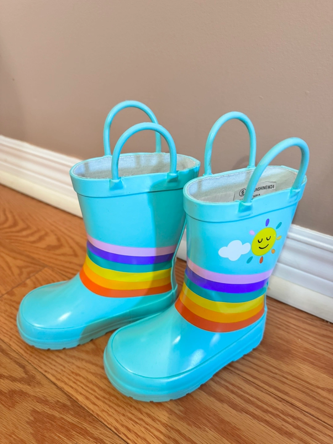 Cute pair of light blue rain boots with a rainbow and sunshine design! Size 6.