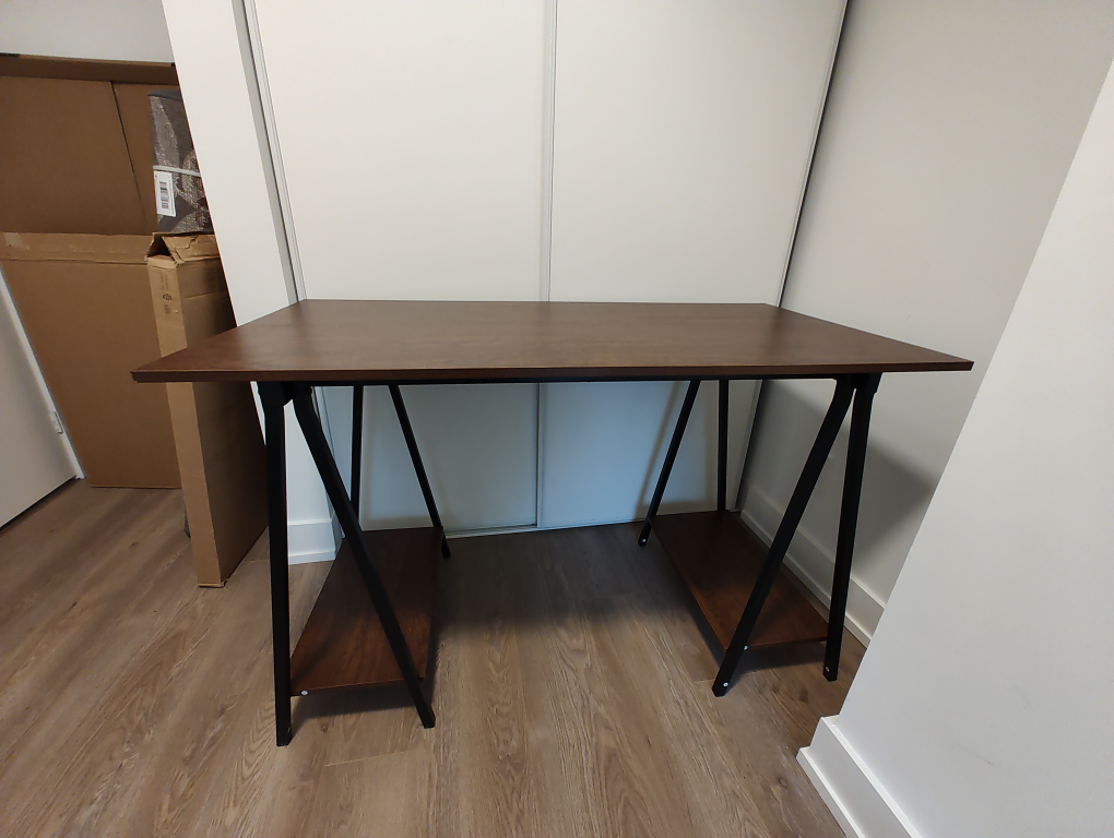Here's a sturdy brown wooden desk that would be perfect for a home office or study space. It features a simple, modern design with black metal legs and two shelves for storage. It's in great condition and ready for a new home!