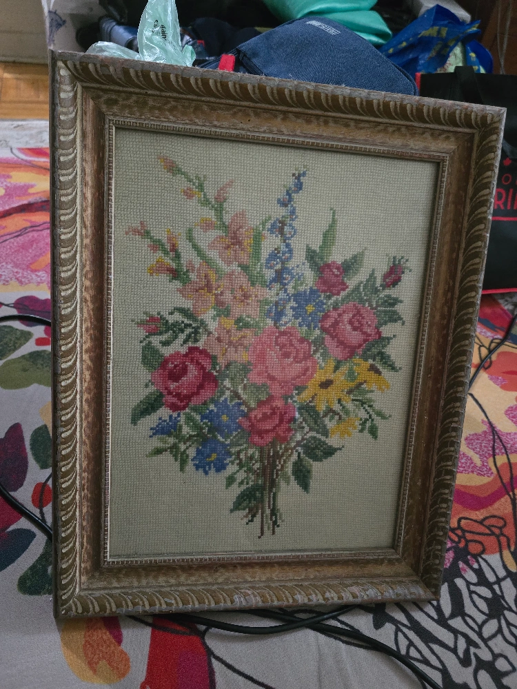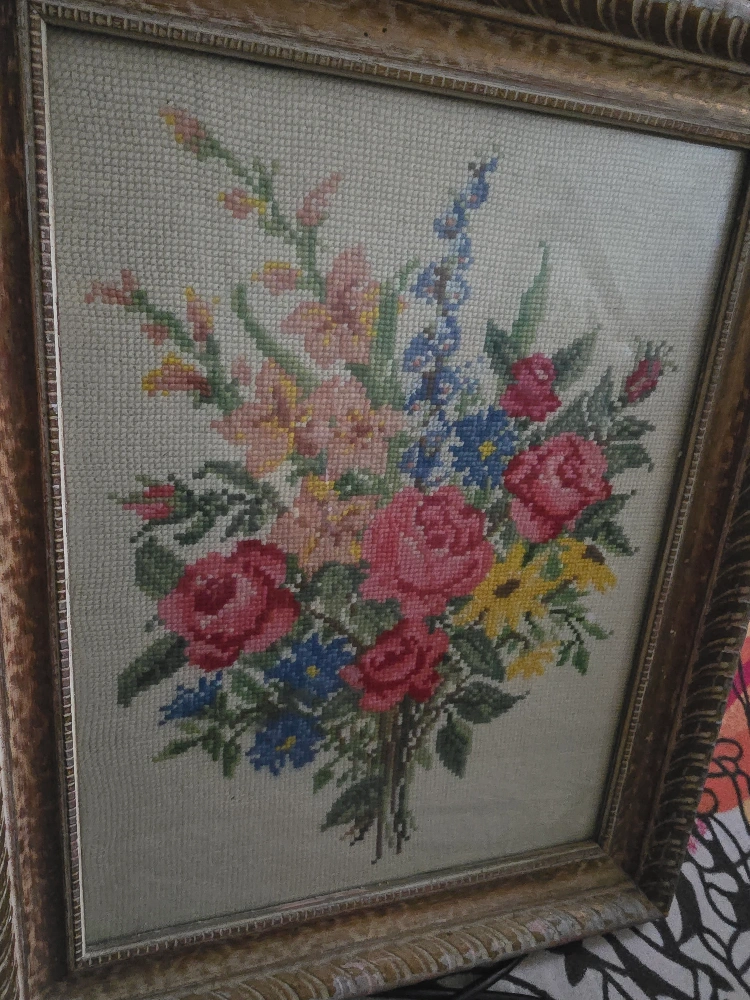 Selling a lovely framed needlepoint picture of a floral arrangement. The frame is gold-toned and the stitching features roses, sunflowers, and other blossoms in a variety of colours. It would be a great addition to any room!