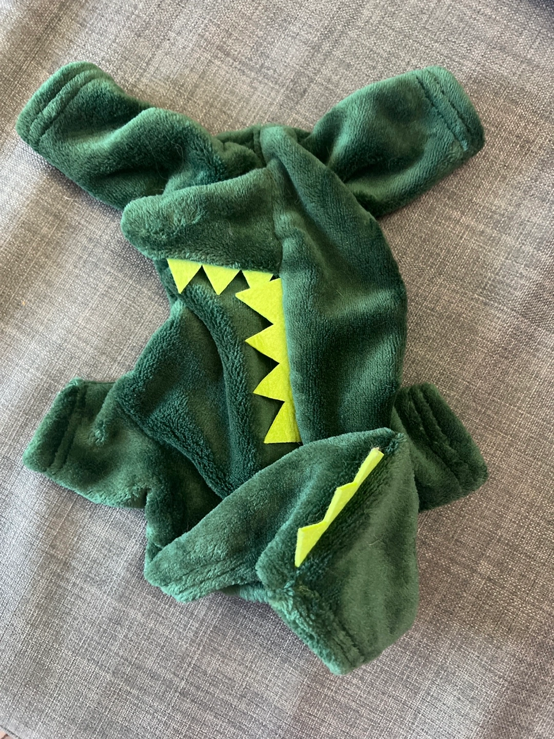A cute green dinosaur costume for your cat or dog Brand new, too small for our small cat Please see pictures for size comparison