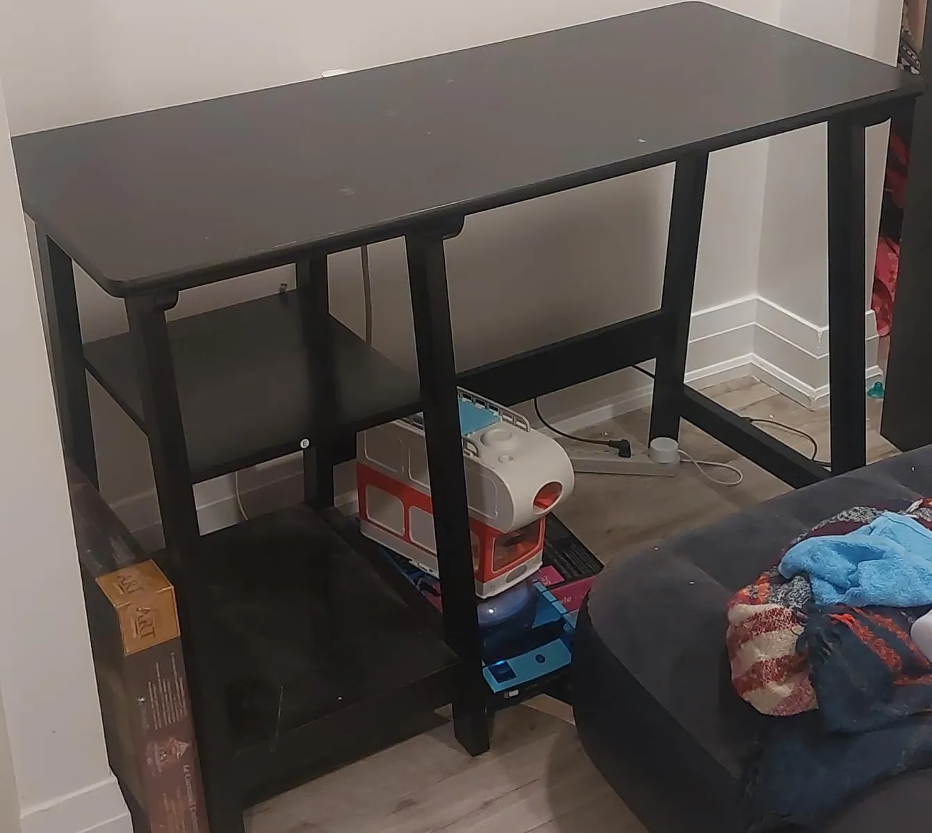 Selling a sturdy black desk that comes with built-in shelves! It's perfect for a home office or study space. The desk provides ample surface area for your computer, books, and other essentials.