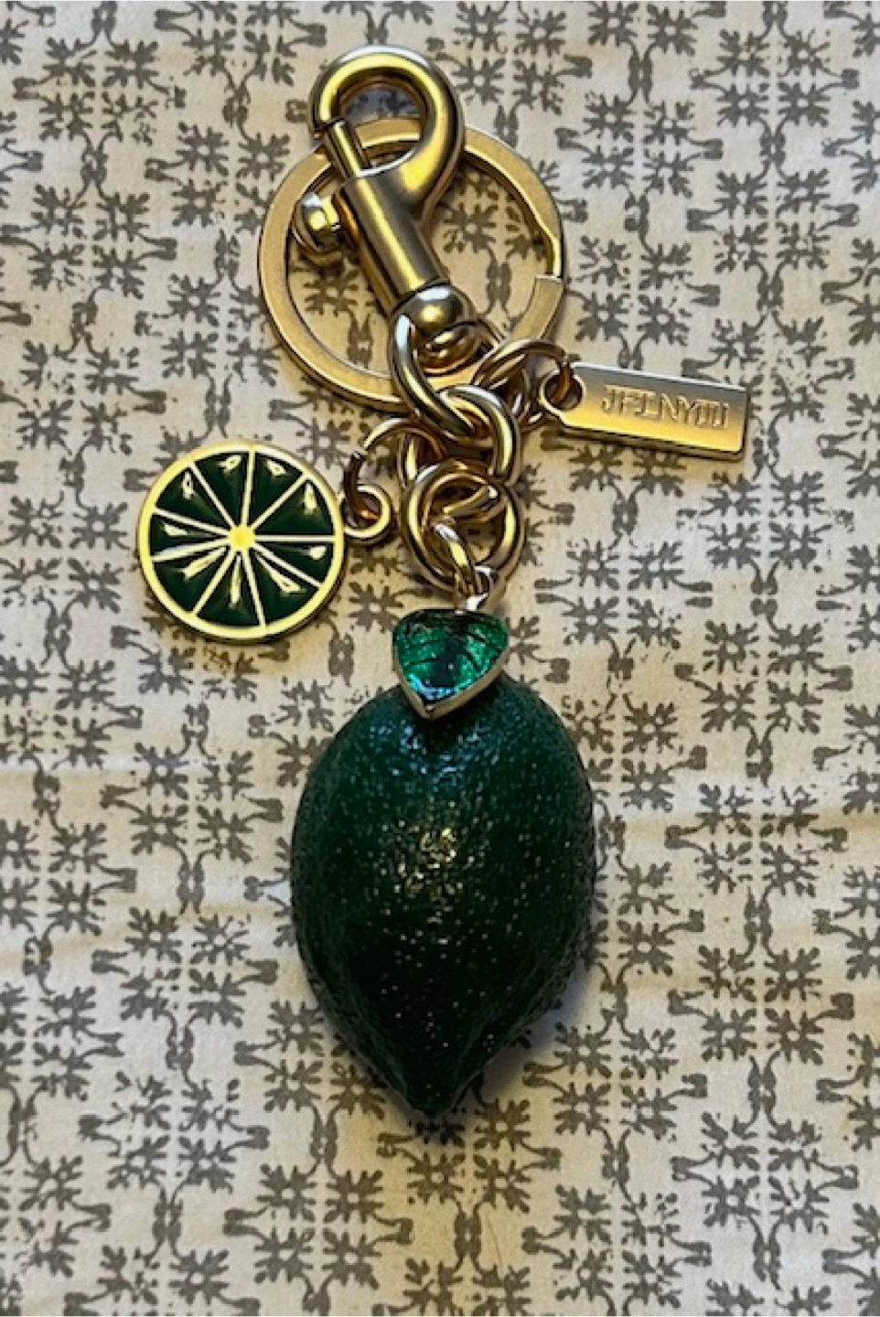 This fun keychain features a lime design with gold-tone hardware. It's perfect for adding a touch of whimsy to your keys or bag! 🤩