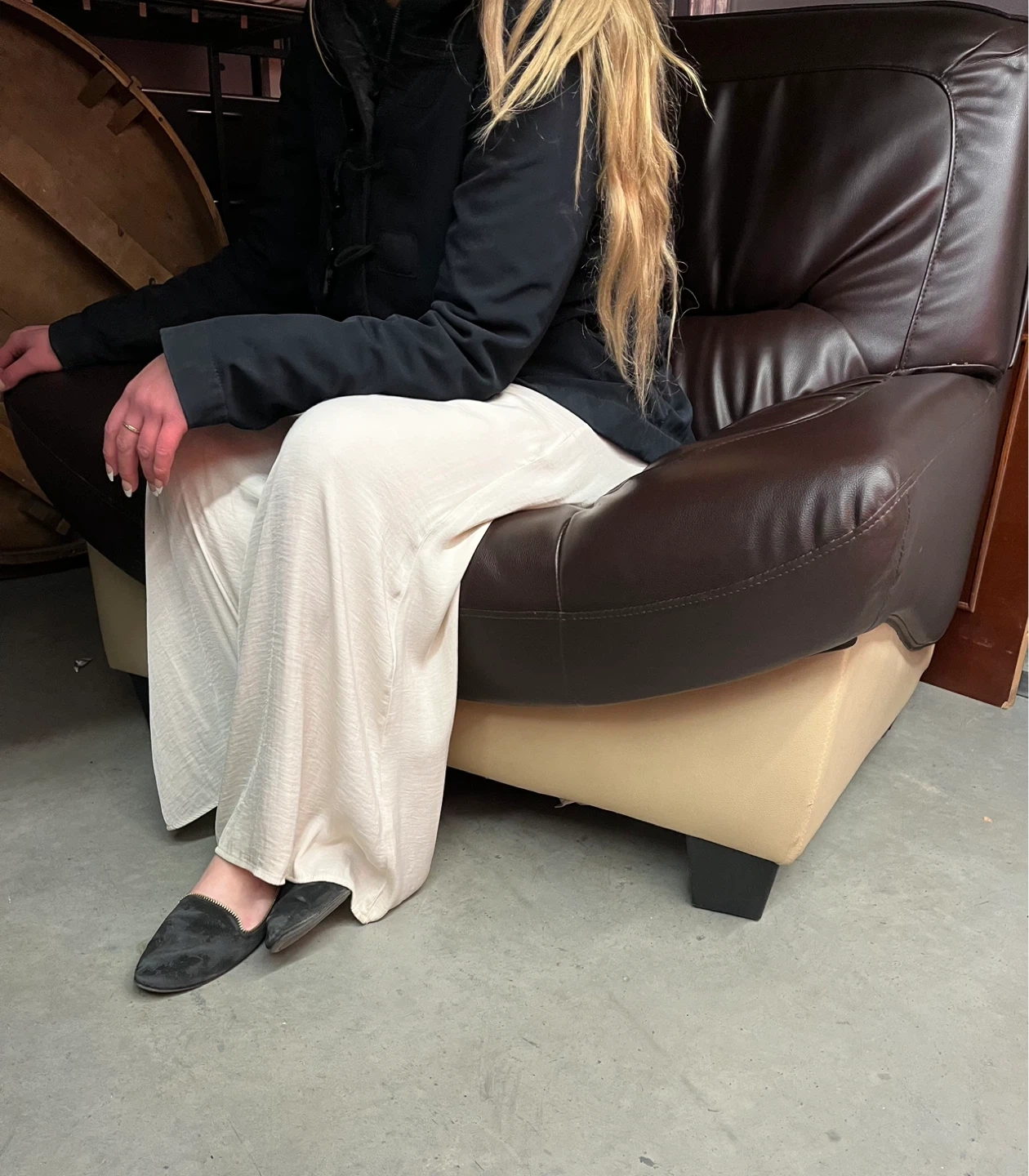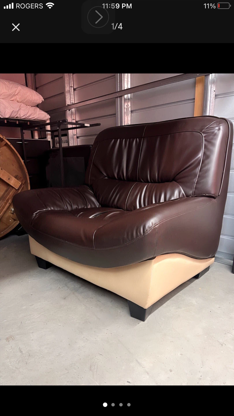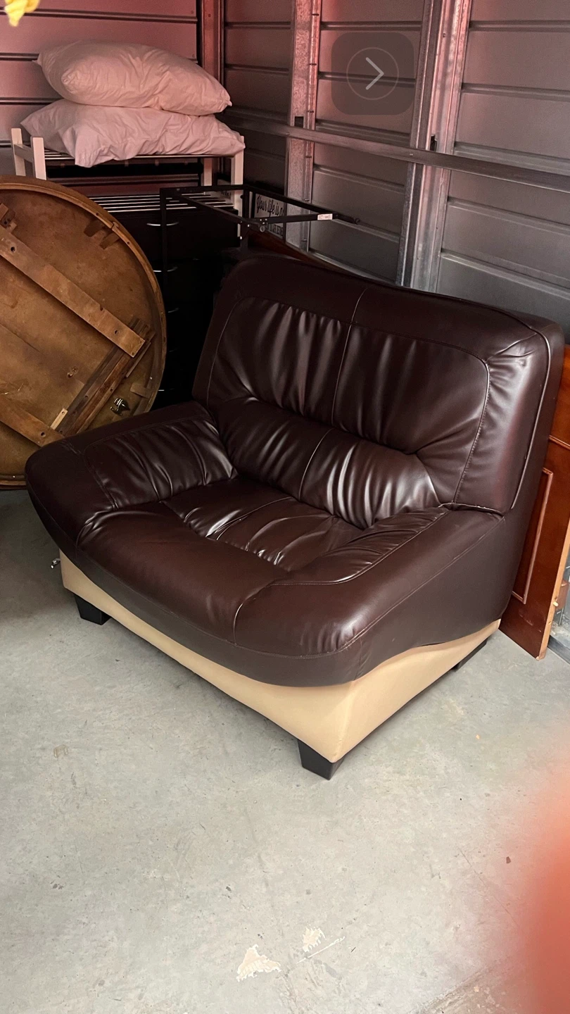 Comfortable Custom Two-Tone Leather contemporary oversized sofa/ accent chair in excellent condition. Perfect for adding a touch of cozy to any room! Light weight easy to move, kept in storage (no pet no smells or use) Pickup in mayland heights/ Barlow
