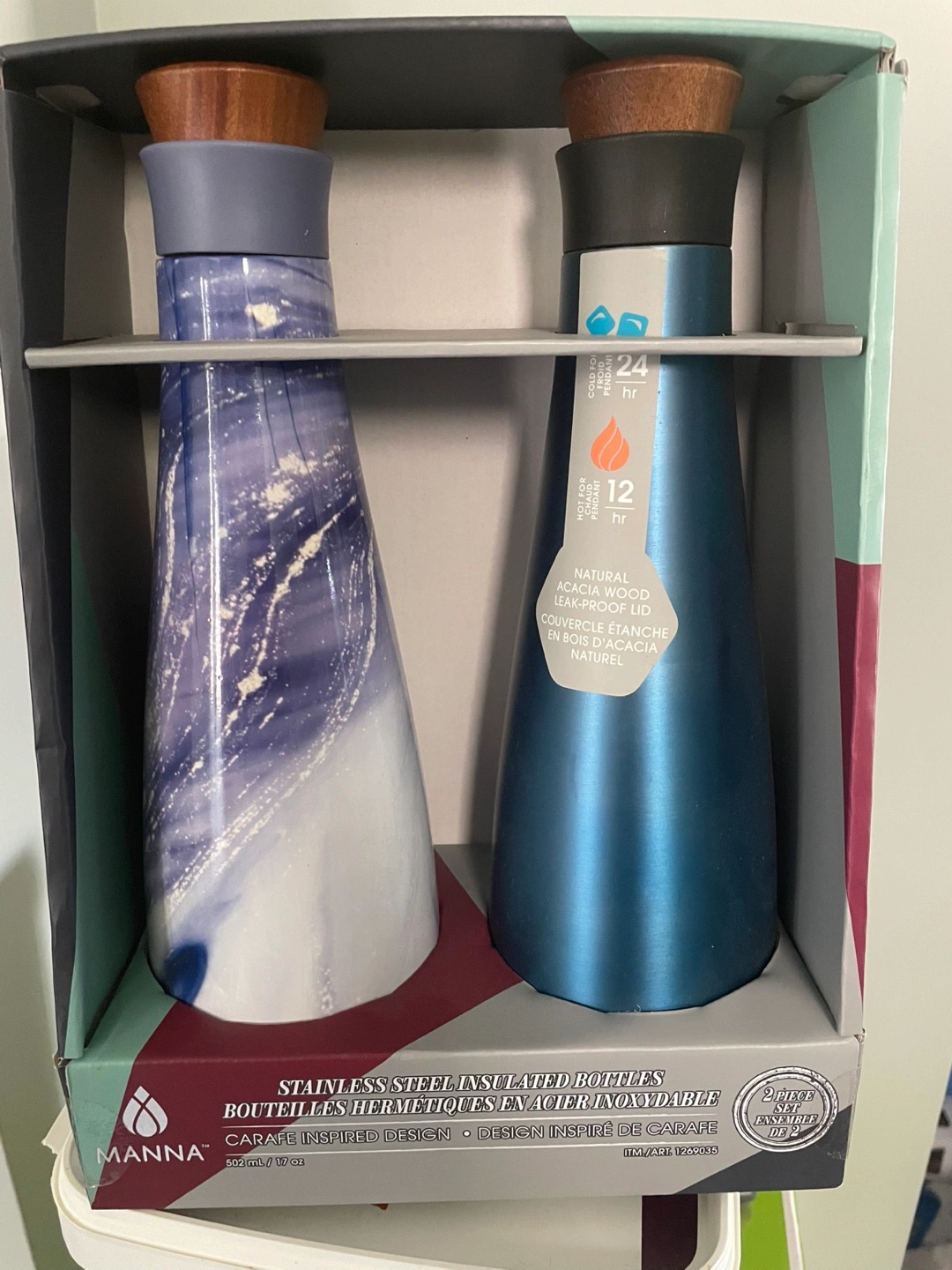I'm selling a set of Manna stainless steel insulated bottles with a carafe-inspired design. They're 502 ml / 17 oz bottles. They feature natural acacia wood leak-proof lids. They're perfect for maintaining the temperature of your drink, keeping cold drinks cold for 24 hours and hot drinks hot for 12 hours. The box is included
