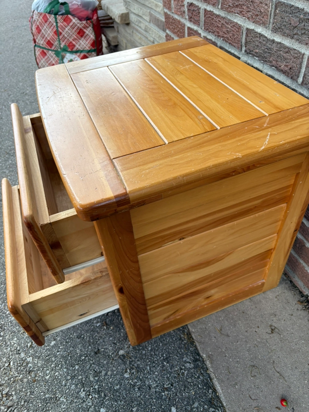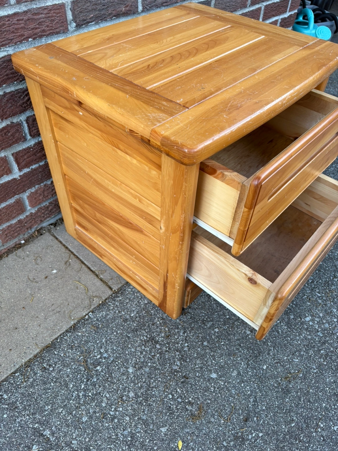 Selling a gently used solid wood two-drawer night table. - made from sturdy pine wood and have a warm, natural finish that works well in any room – ideal for a child’s bedroom, guest room, or cottage.