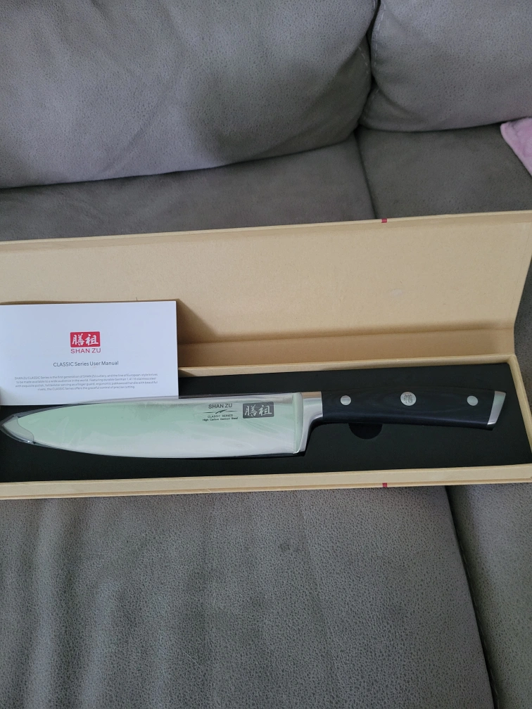 Selling a brand new SHAN ZU Classic Series chef's knife. It's still in its original box and comes with the user manual. This knife is perfect for any home cook looking for a reliable and high-quality tool in the kitchen
