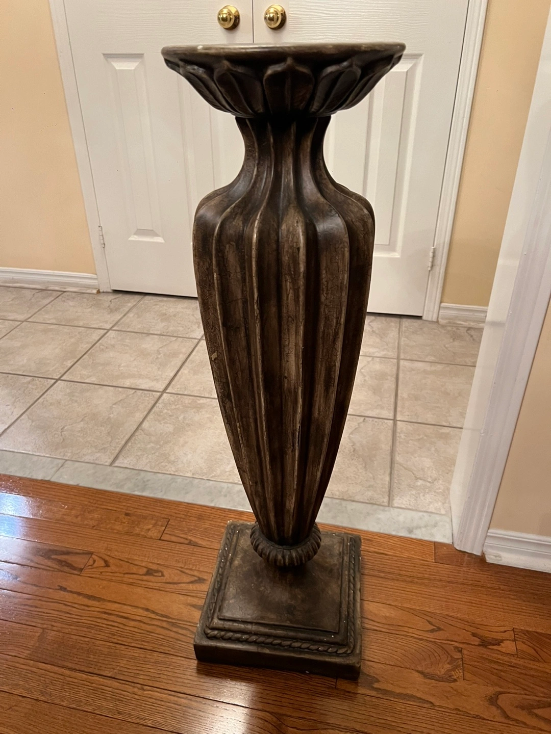 65Selling a lovely decorative plant stand with a bronze-look finish. It's perfect for adding a touch of elegance to any room. It has a square base and a fluted design along the body. In great condition!