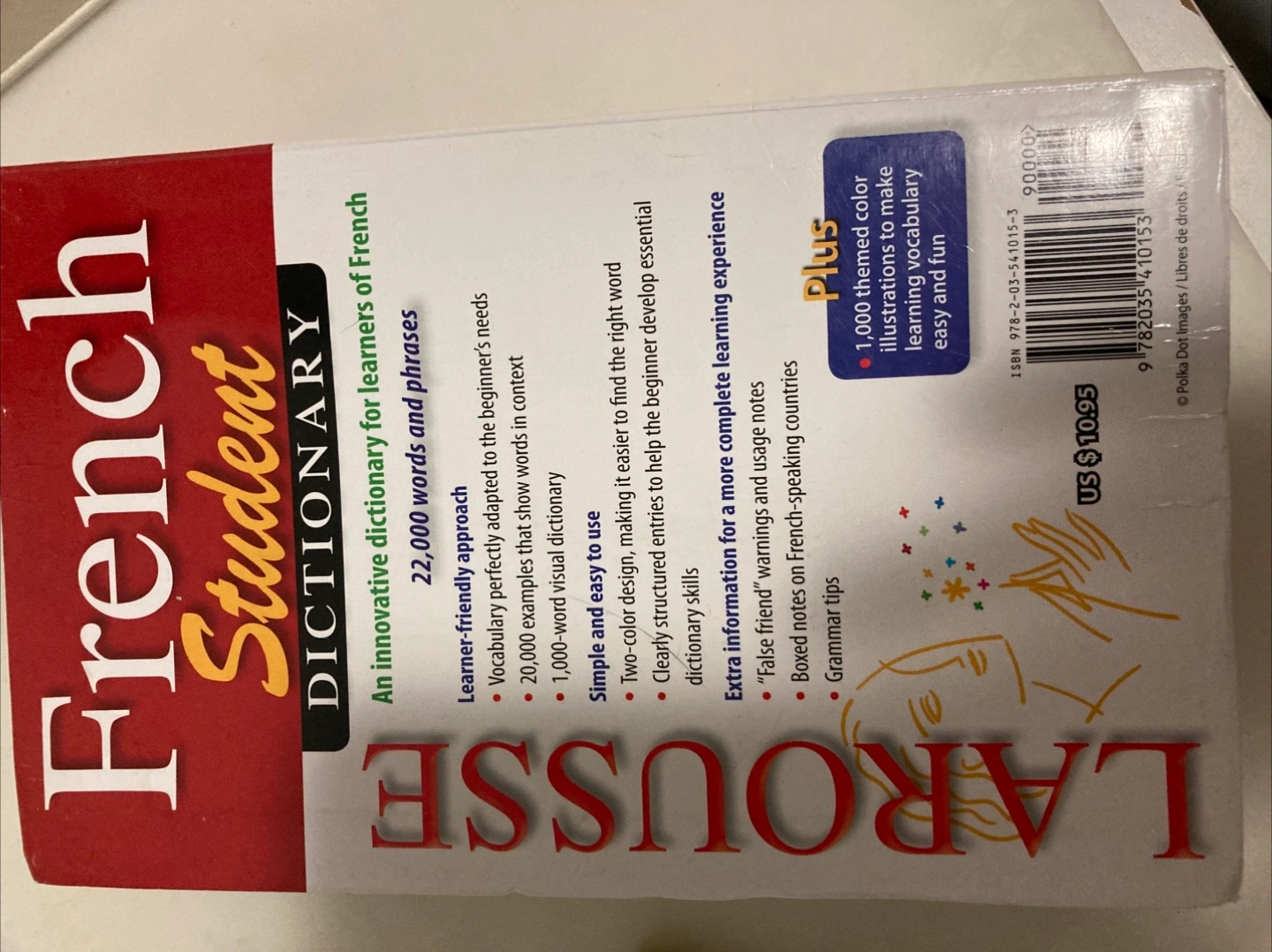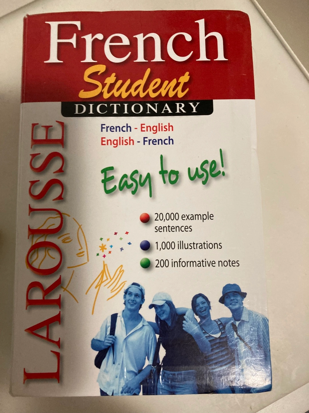 Selling a French Student Dictionary by Larousse! It's an innovative dictionary for learners of French, featuring 22,000 words and phrases. It includes 1,000 themed colour illustrations to make learning vocabulary easy and fun, plus 20,000 example sentences and 200 informative notes