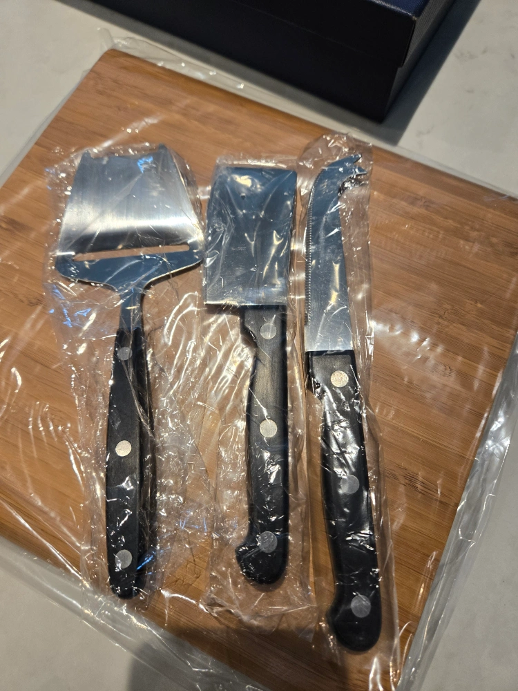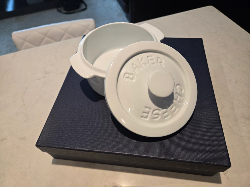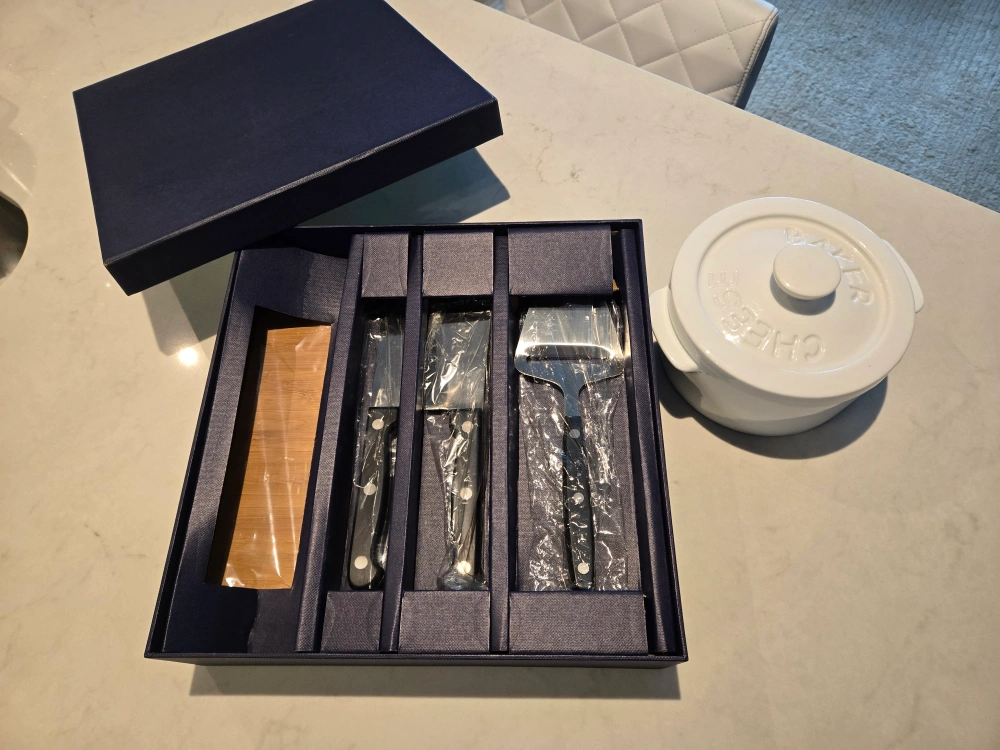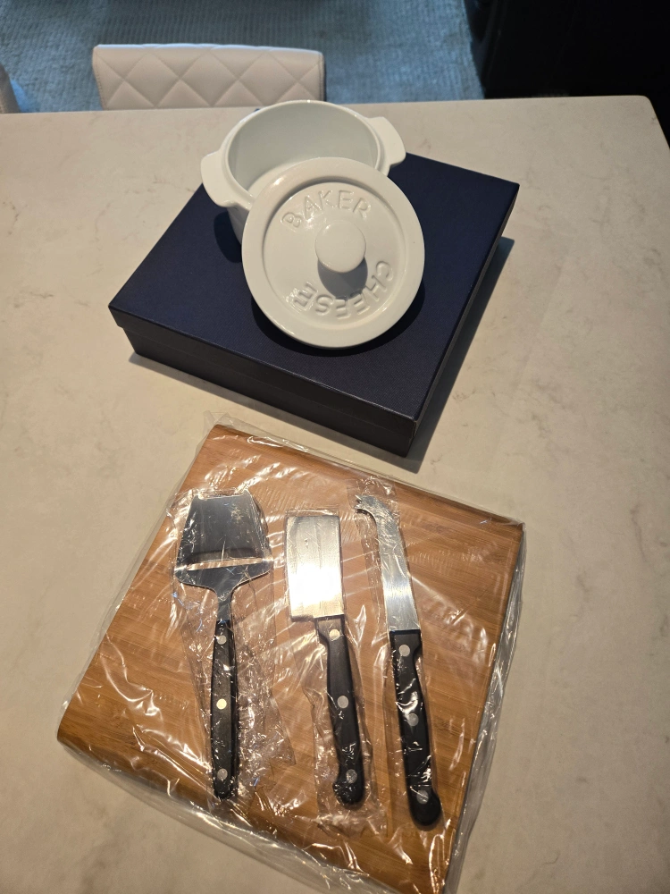 Brand new cheese baker and tools set! Comes with the baker, a wooden board, and three cheese knives. The set is still in its original box, making it a perfect gift for any cheese lover!