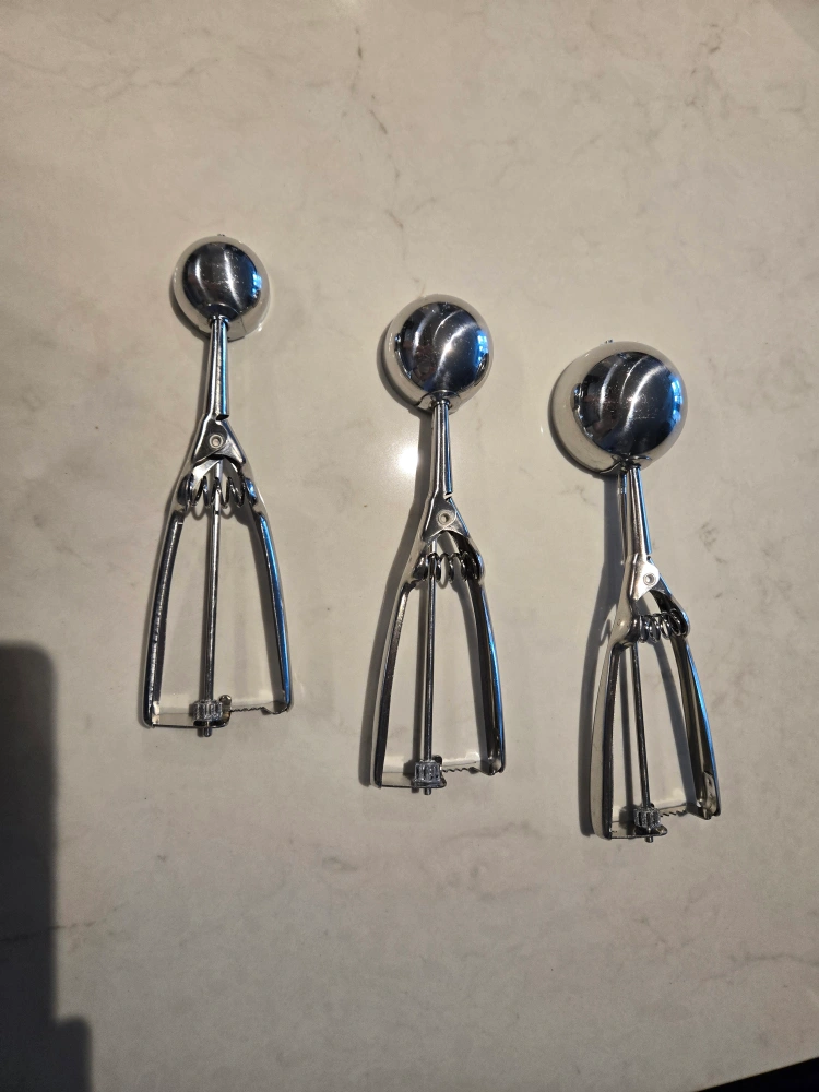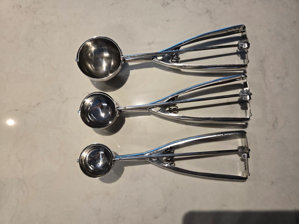 Selling a set of three stainless steel cookie/ice cream scoops - small, medium and large. They come in handy! They're in good condition and ready for a new home