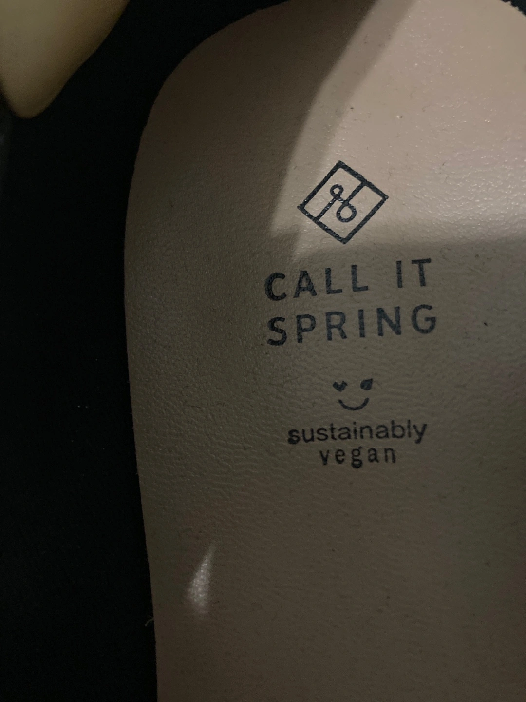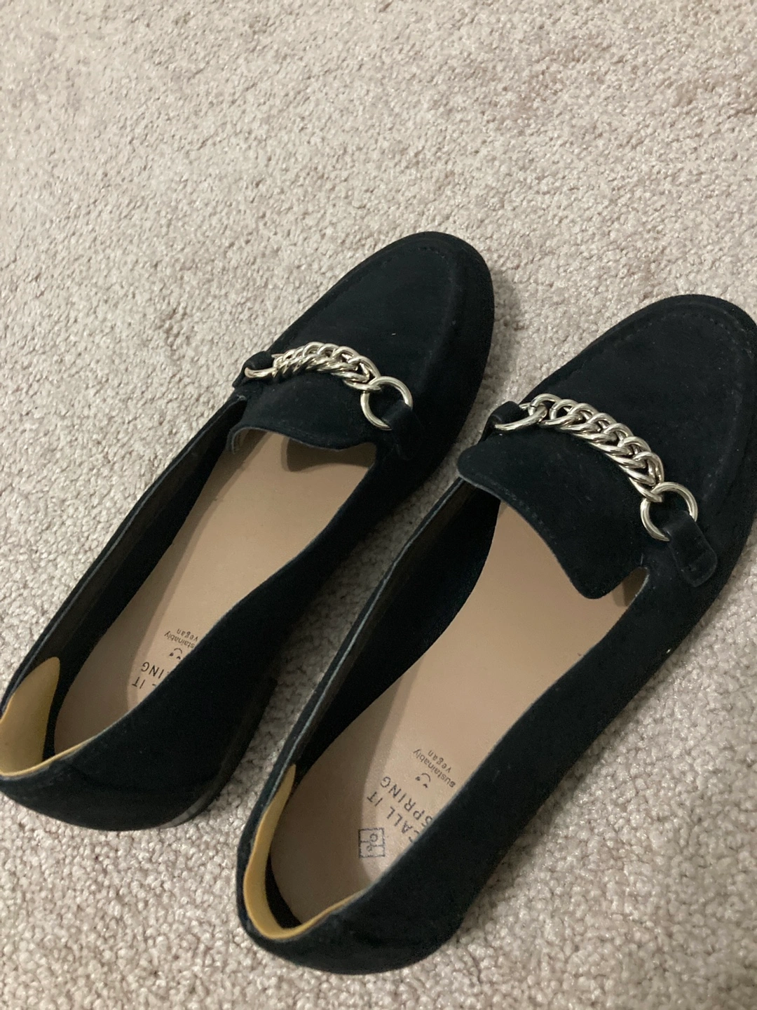 These are a pair of Call It Spring loafers in black. They feature a silver chain detail across the top. They are sustainably vegan!