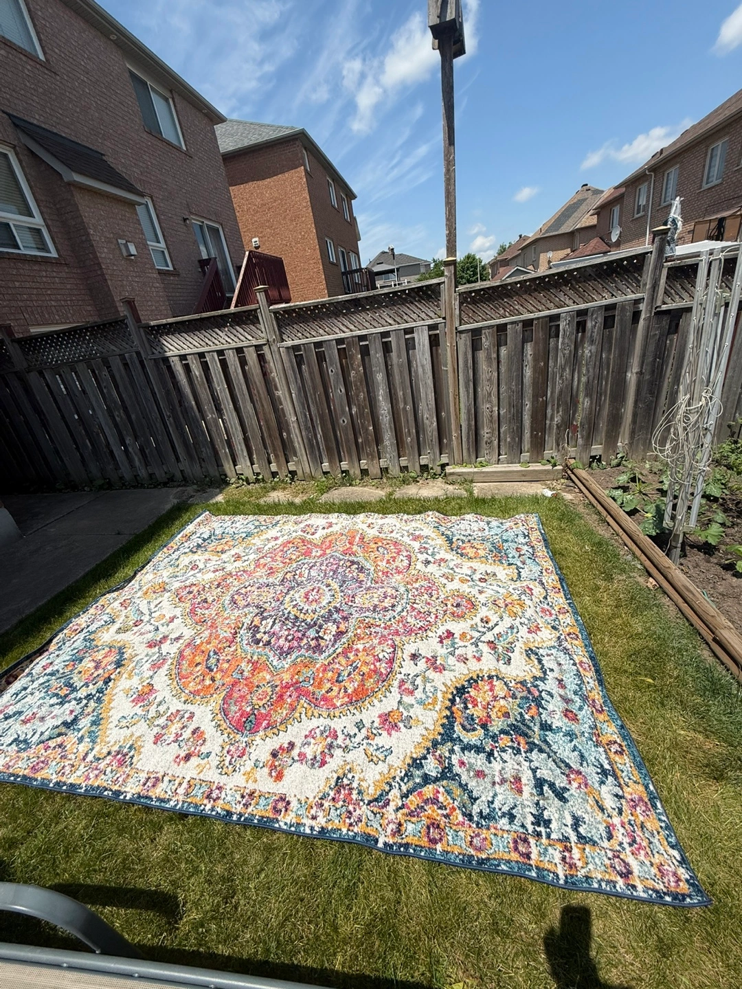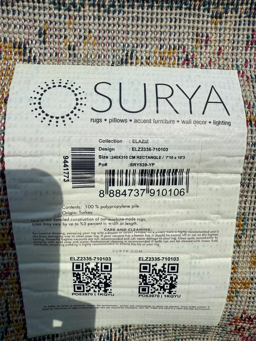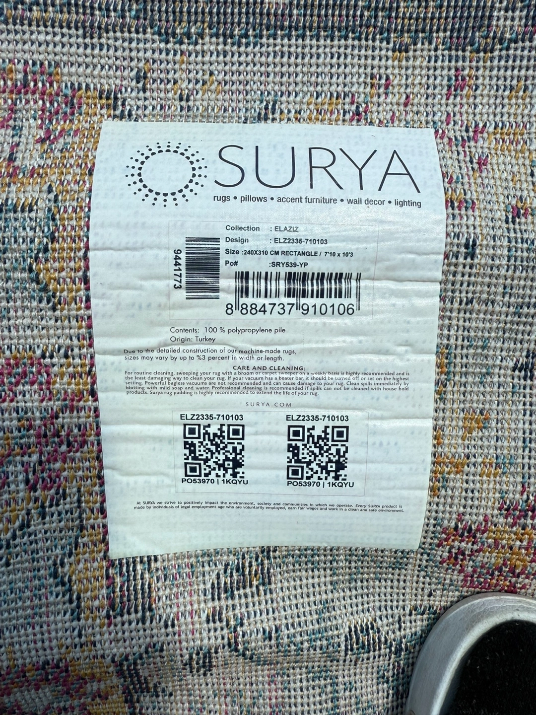 Selling a Surya Elaziz area rug, sized 7'10 x 10'3. It's made of 100% polypropylene pile and was made in Turkey. The rug is multi-coloured and would look great in any room!