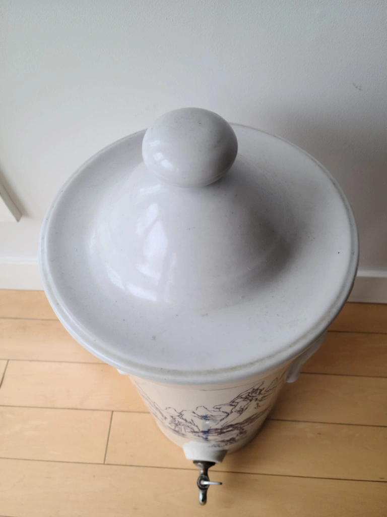 I am selling a Rare Antique Stoneware Water Filter - Miniature Doulton-style with Filter in great, vintage condition. Elevate your home decor with this stunning piece of Victorian-era utility. This rare, oversized stoneware water filter features a beautiful blue-and-white transferware mountain landscape, reminiscent of classic Doulton or Royal Doulton designs. It is a perfect blend of historical significance and rustic elegance.