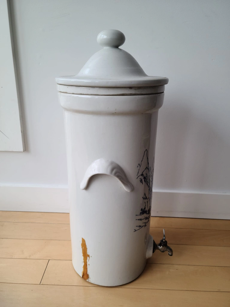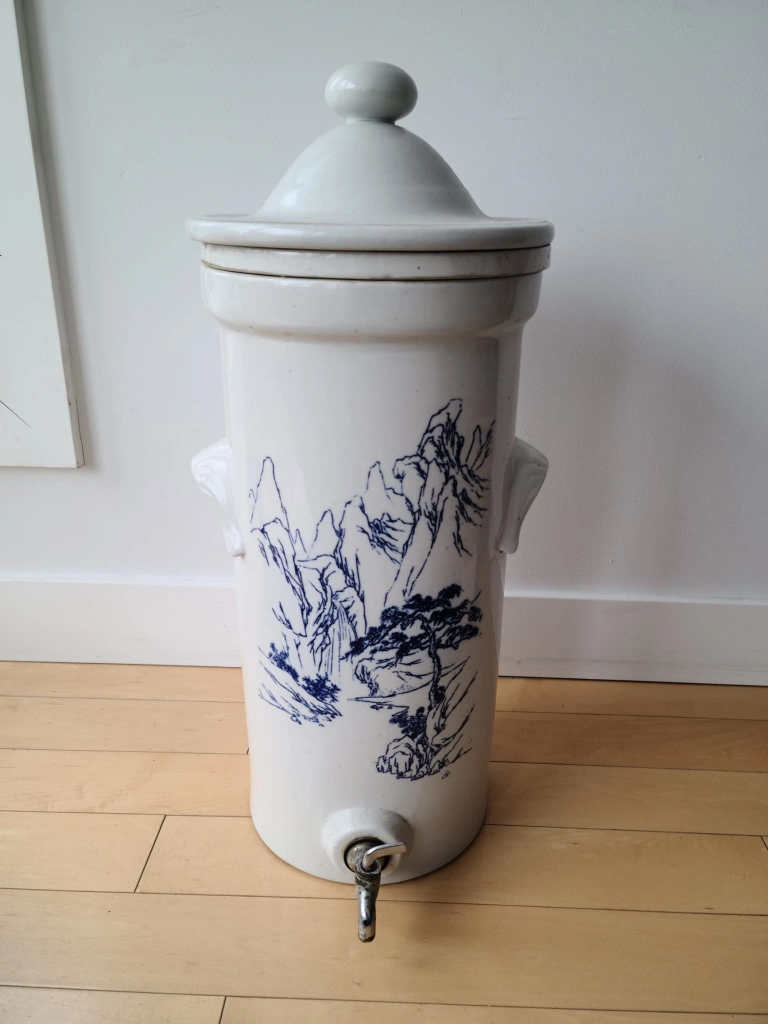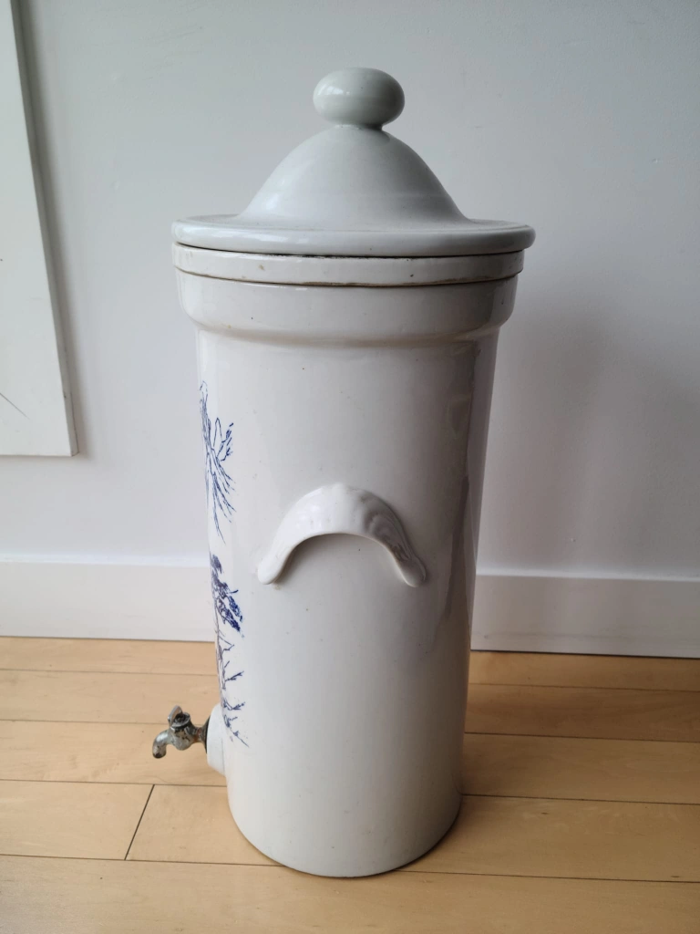 Still in working condition; however, there are small droplets of water that drips from the old vintage faucet when water is inside. Interior section and 2 white porous ceramic filters rods for removing bacteria from drinking water. This is a beautiful and rare antique stoneware water filter, reminiscent of the classic Doulton style. A charming piece of history, this filter is a unique blend of function and decorative art. The tall, cylindrical body is adorned with a delicate blue-and-white landscape featuring mountains and trees, adding a touch of traditional artistry.