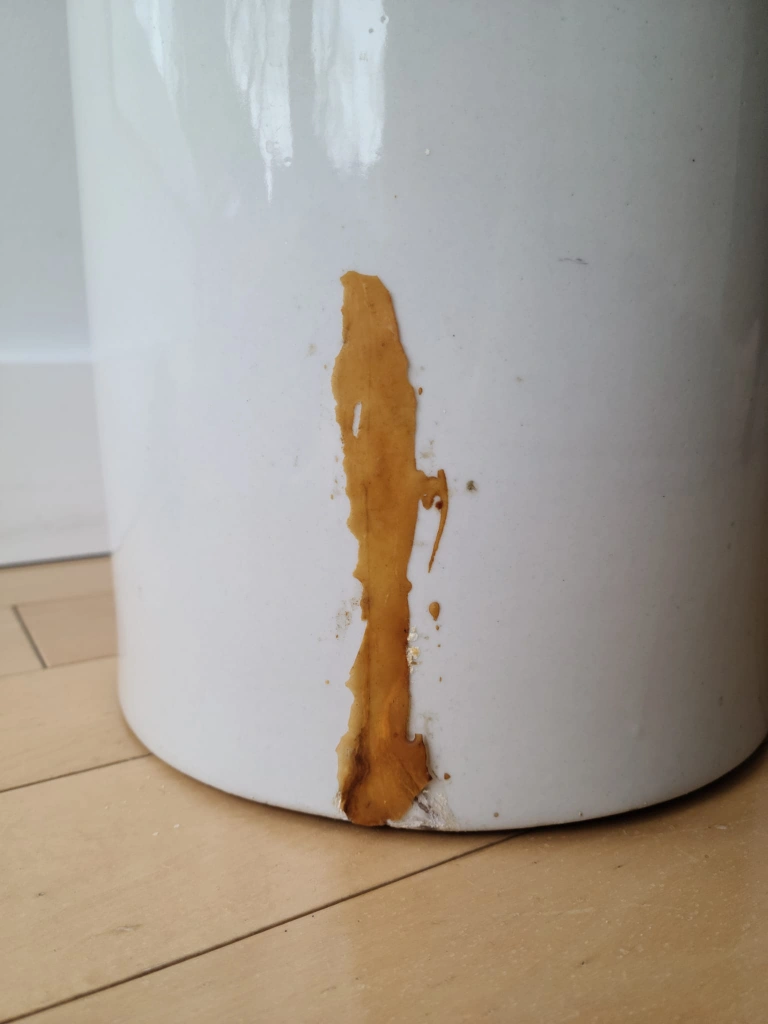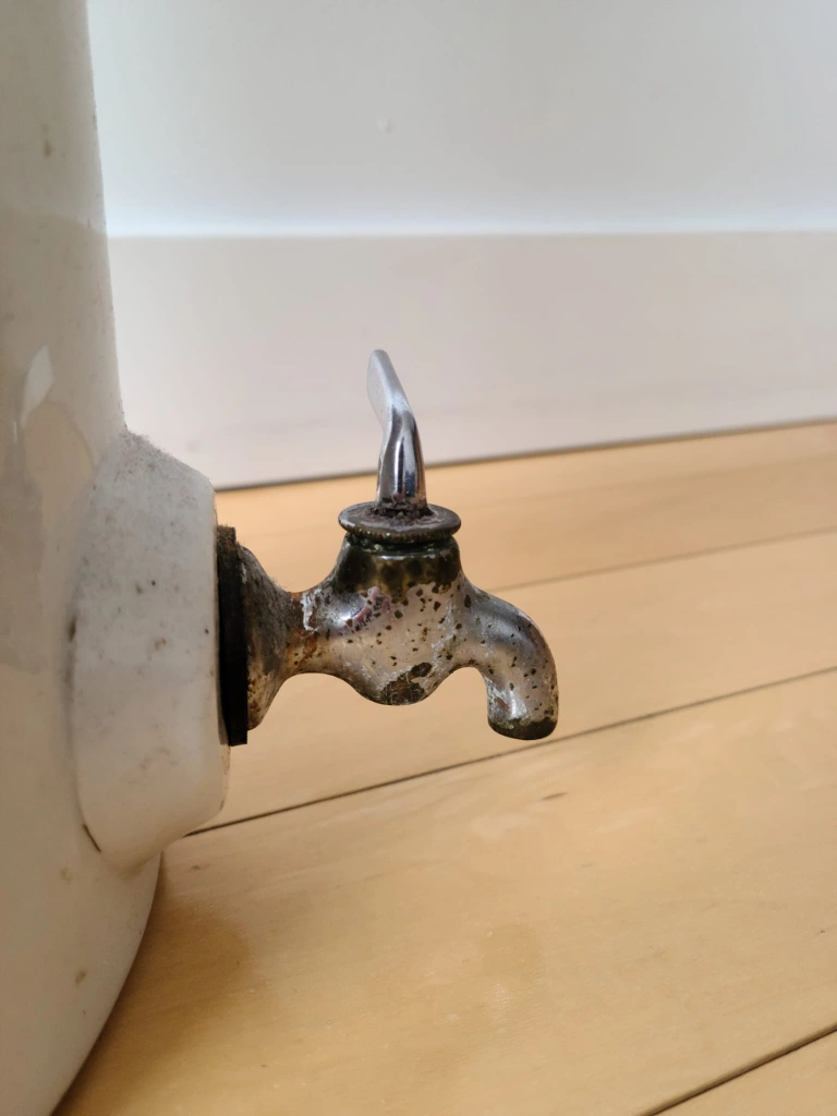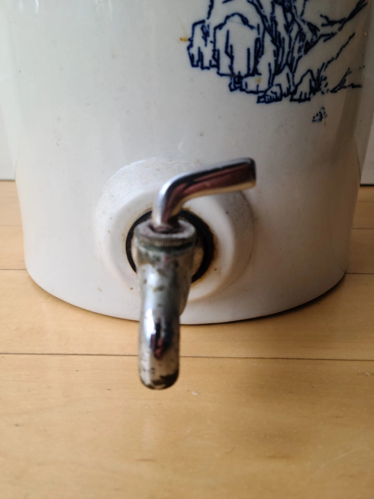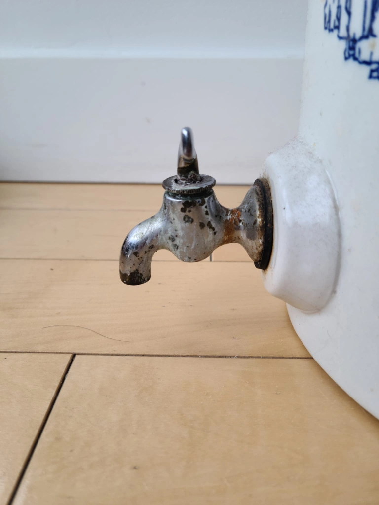 * Drip: The vintage metal spigot has a small drip when water is inside the vessel. This is a common characteristic of older spigots and could be addressed by a collector if desired, or appreciated as part of its antique charm.