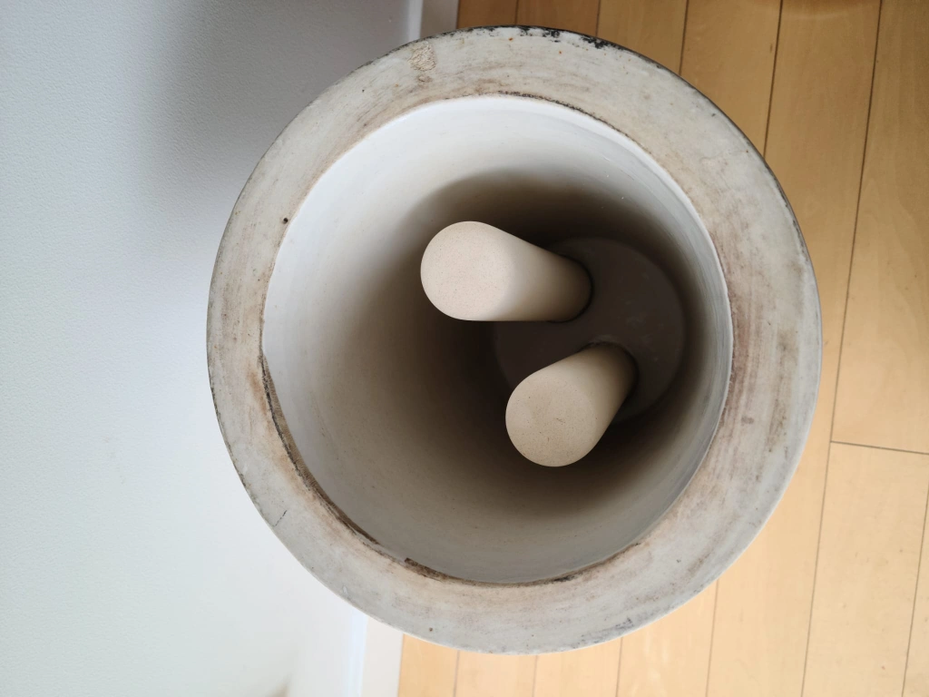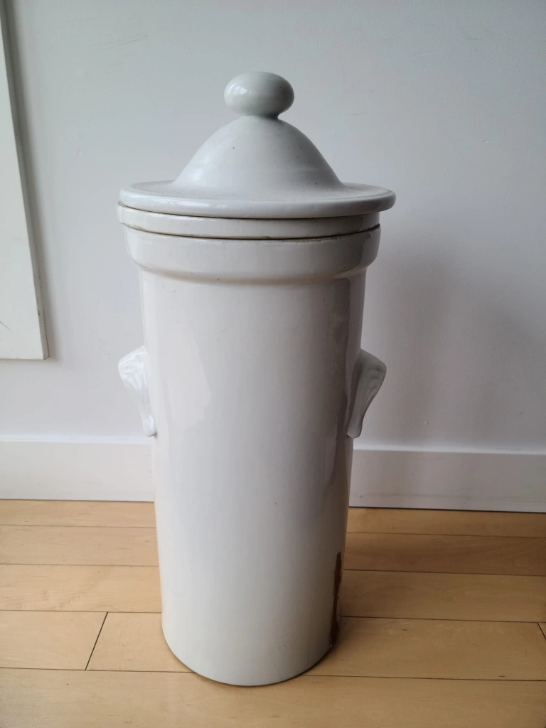 This unit includes the original two porous ceramic filter rods inside, designed for purifying drinking water—a testament to its historical use. It comes complete with its original ceramic domed lid and a vintage spigot. This water filter is not only a fantastic piece for a collector of stoneware or historical kitchenware but also a unique decorative object. It would look magnificent as a centerpiece in a rustic kitchen, a farmhouse-style home, or a vintage-inspired space.