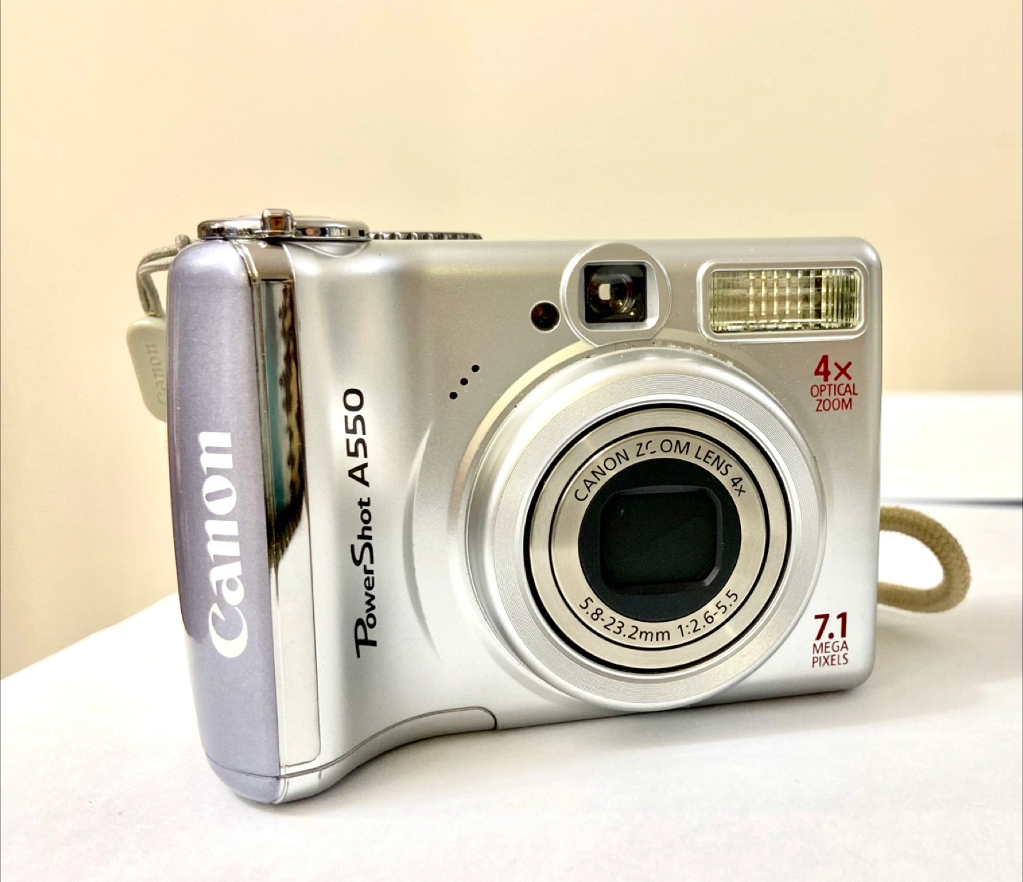 Selling a Canon PowerShot A550 digital camera in silver. It features a 4x optical zoom and 7.1 mega pixels. comes with a silver pouch, camera strap, cables and instructional manual. Great for capturing memories!