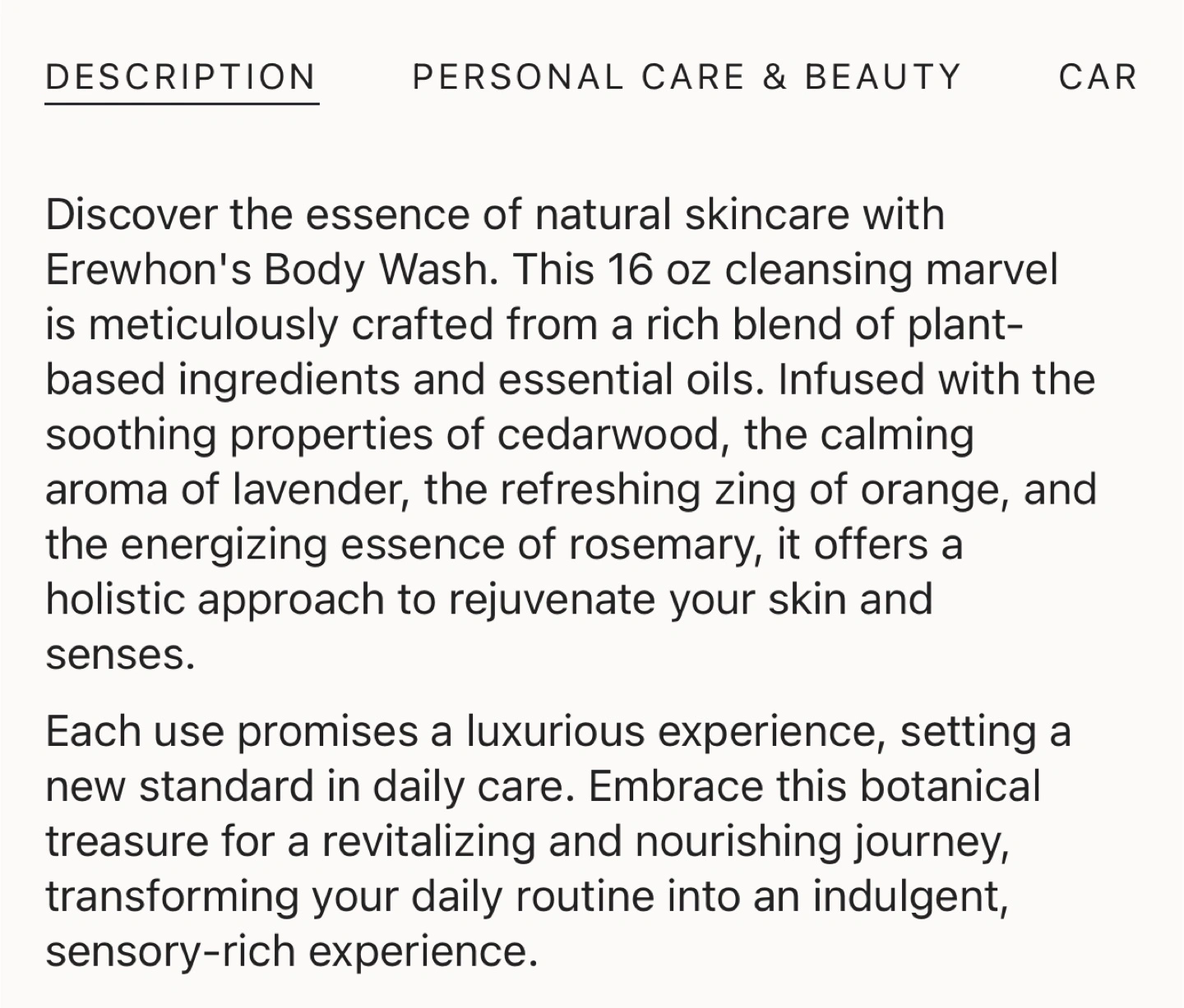 Brand New. Smoke Free / Pet Free Home. Picked this up at the Beverly Hills Erewhon when I was in LA Pick up on the corner of Grant St and Nanaimo Street (next to the new Folietta restaurant and beside To Live For Bakery) If the ad is up, it’s still available. Let me know when you can come by in your message ________\ Discover the essence of natural skincare with Erewhon's Body Wash! This 16 oz cleansing body wash is crafted from plant-based ingredients and essential oils. Infused with cedarwood, lavender, orange, and rosemary, it offers a holistic approach to rejuvenate your skin and senses