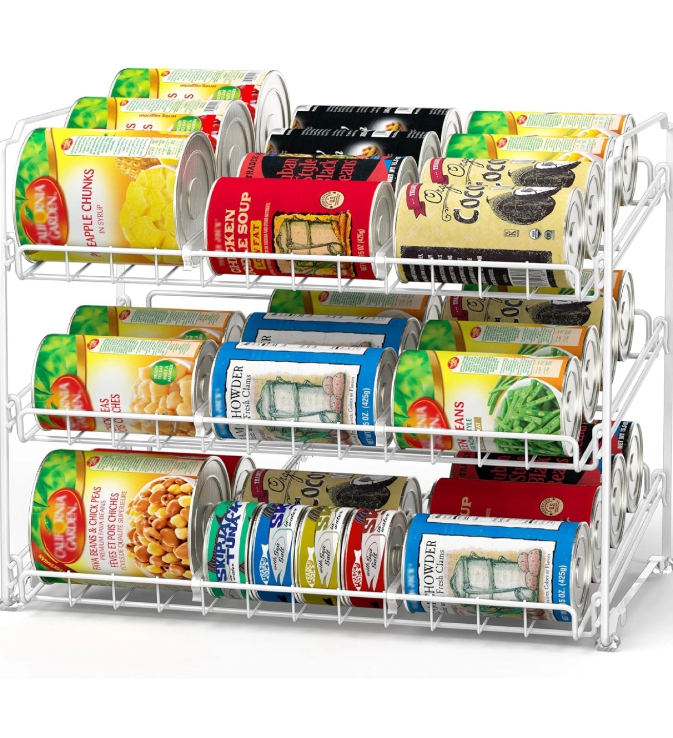 This 3-tier stackable can rack organizer is perfect for keeping your pantry tidy! It's great for organizing your cans and other items. Its dimensions are approximately 17.5"W x 12"D x 16"H.