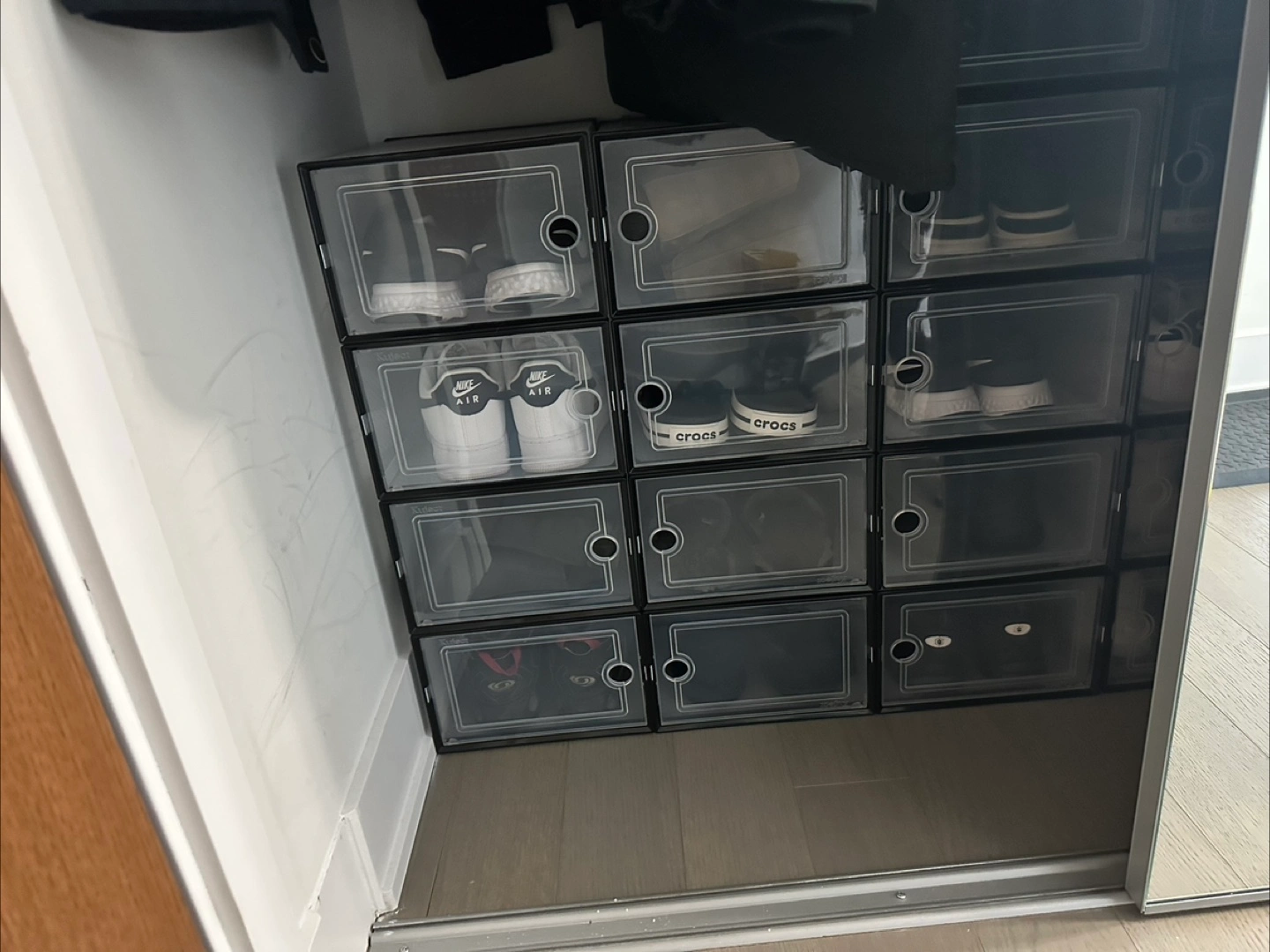 Selling a set of clear shoe storage boxes! These stackable organizers are perfect for keeping your shoes neat and tidy. They're in great condition and ready to help you declutter your space