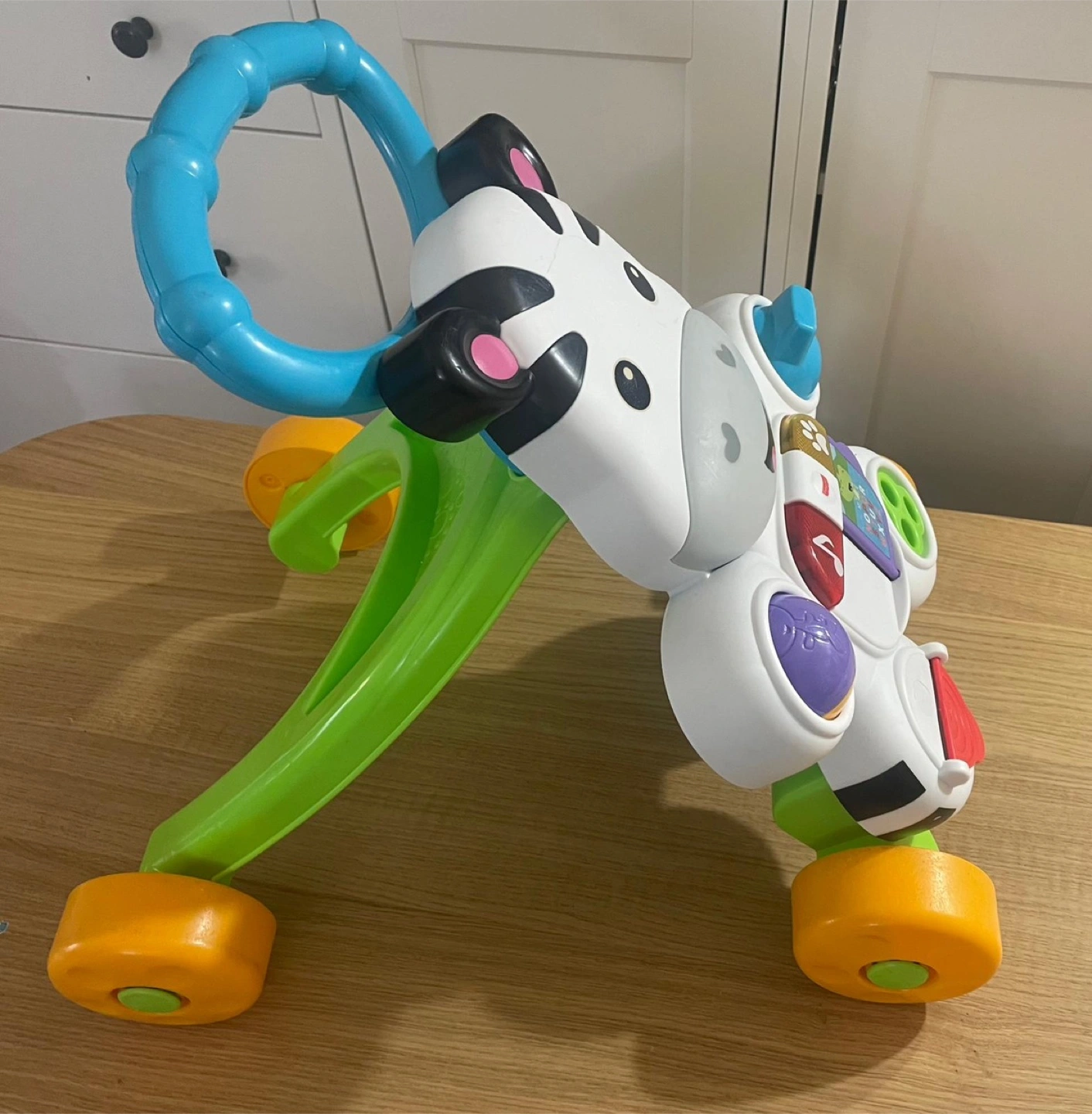 Selling a gently used Fisher-Price Learn with Me Zebra Walker! It's in great shape and ready for a new little one to enjoy. This interactive walker helps encourage first steps while teaching ABCs, 123s, and more through fun phrases and songs. It's perfect for babies and toddlers!