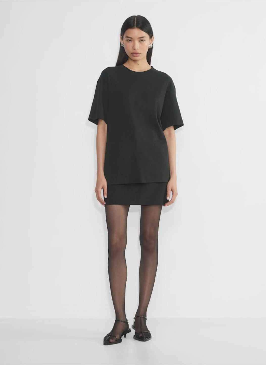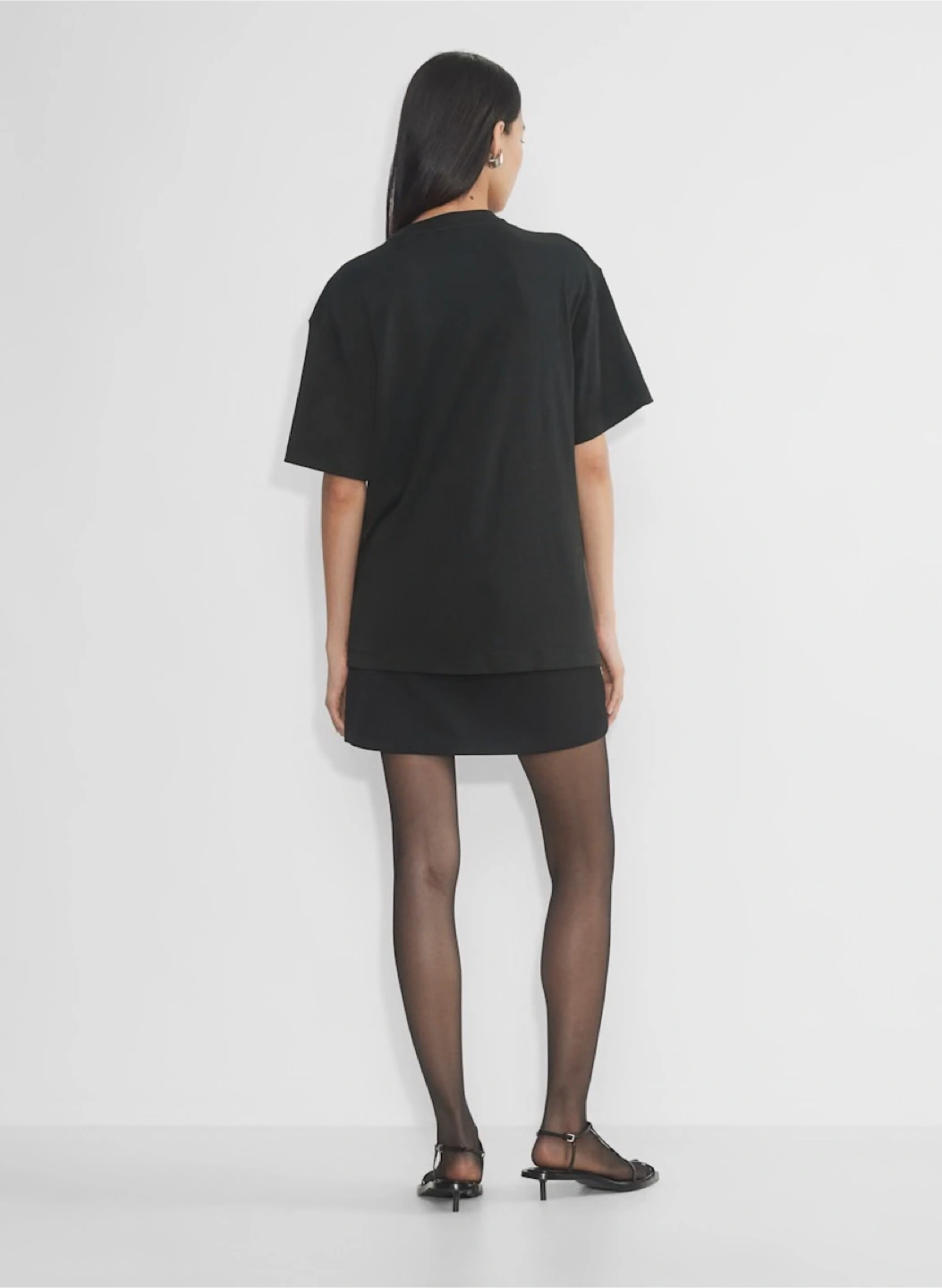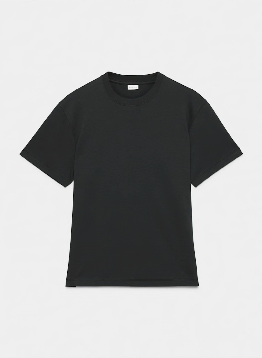 This is a crewneck t-shirt with dropped shoulders. It's cut from softly structured heavyweight 100% Pima cotton from Peru.