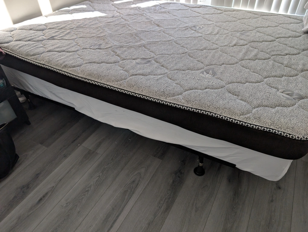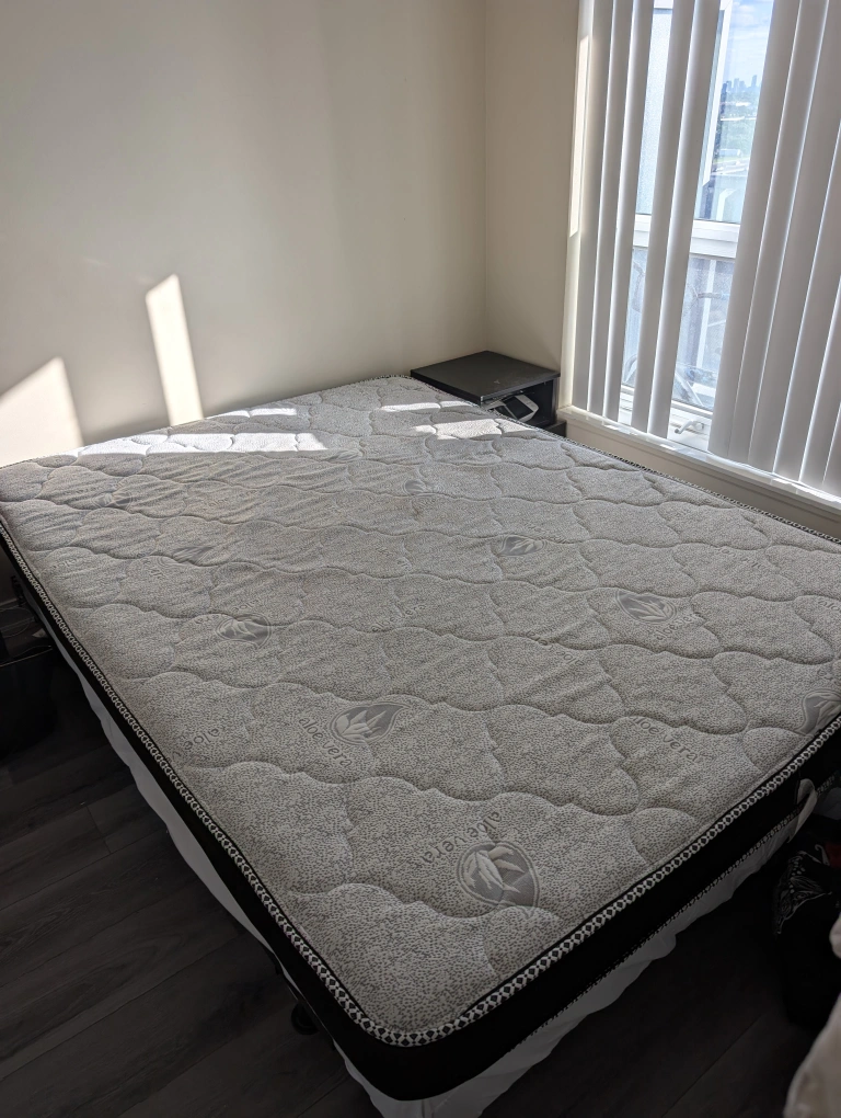 Selling a queen-size mattress, Boxspring and metal bedframe. They're all in great condition and ready for a new home! This mattress offers a comfortable and supportive sleep experience. No headboard.