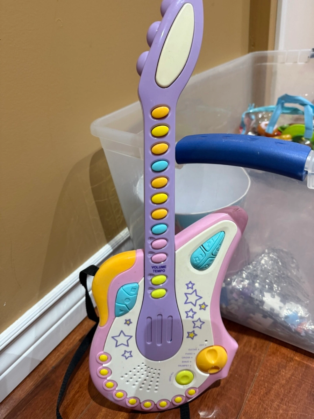 Selling a cute toy guitar for kids! It's in good condition and features fun colours like pink and purple. Perfect for little ones who love music and want to explore their creativity