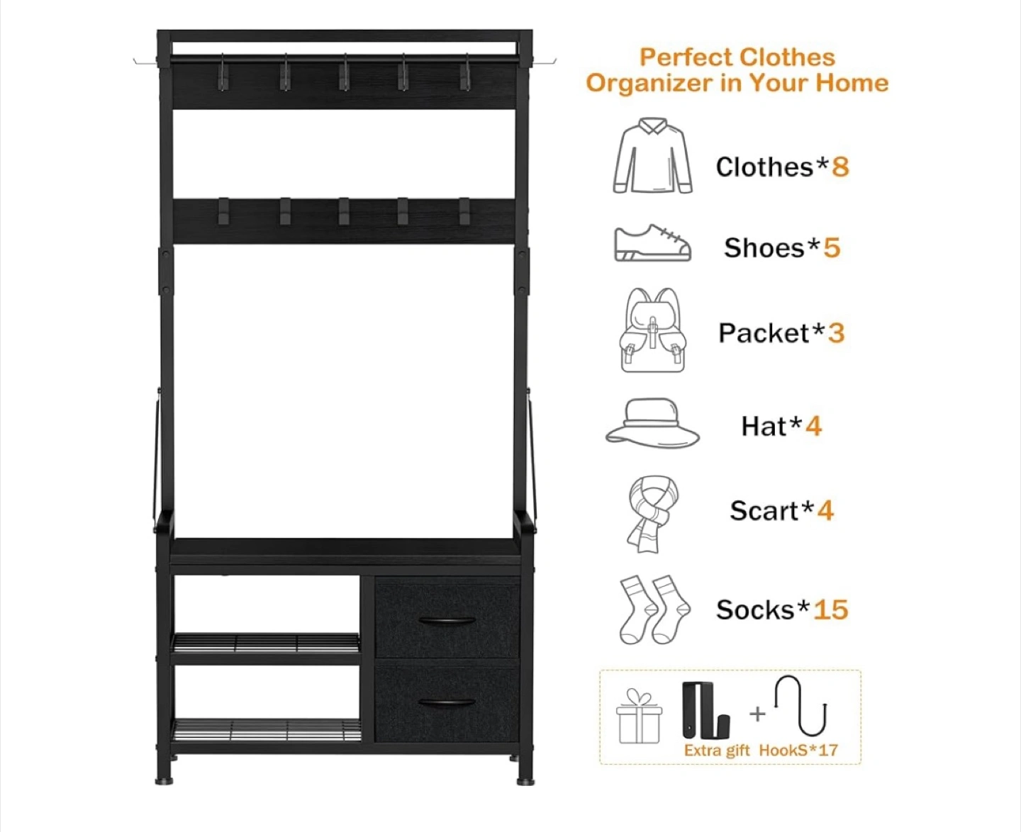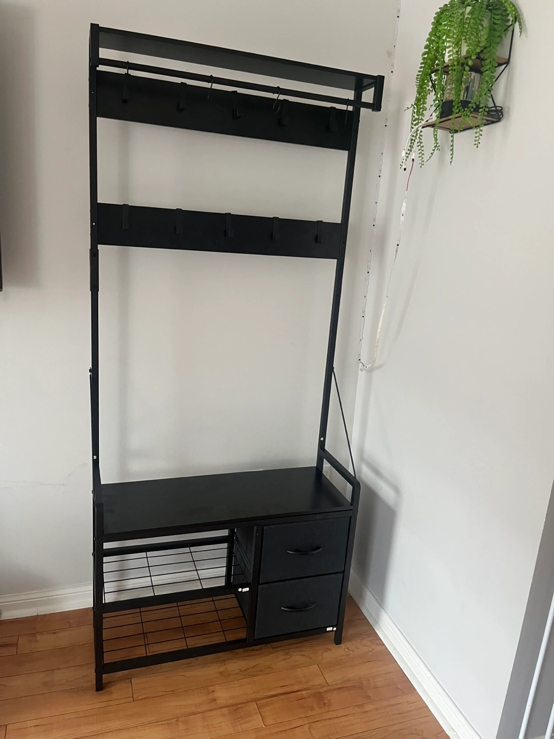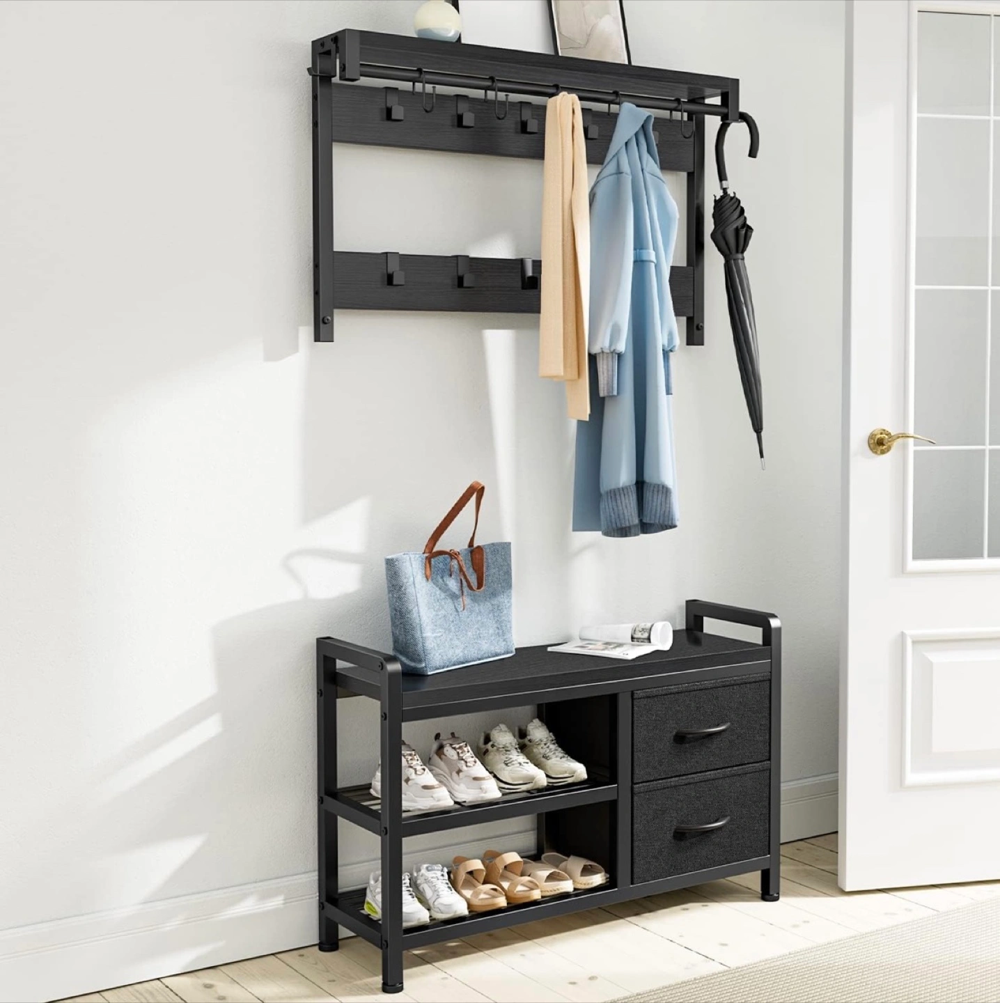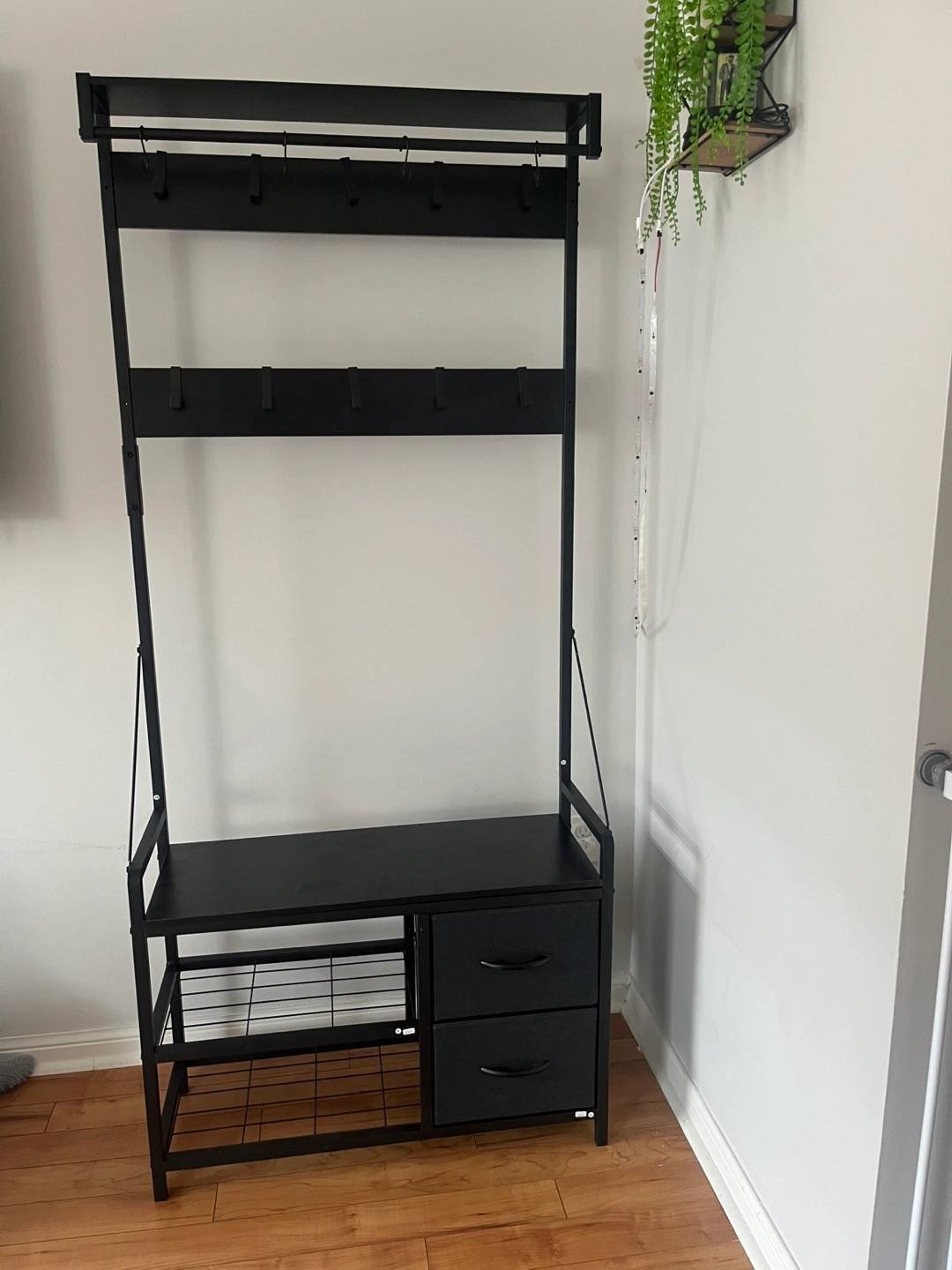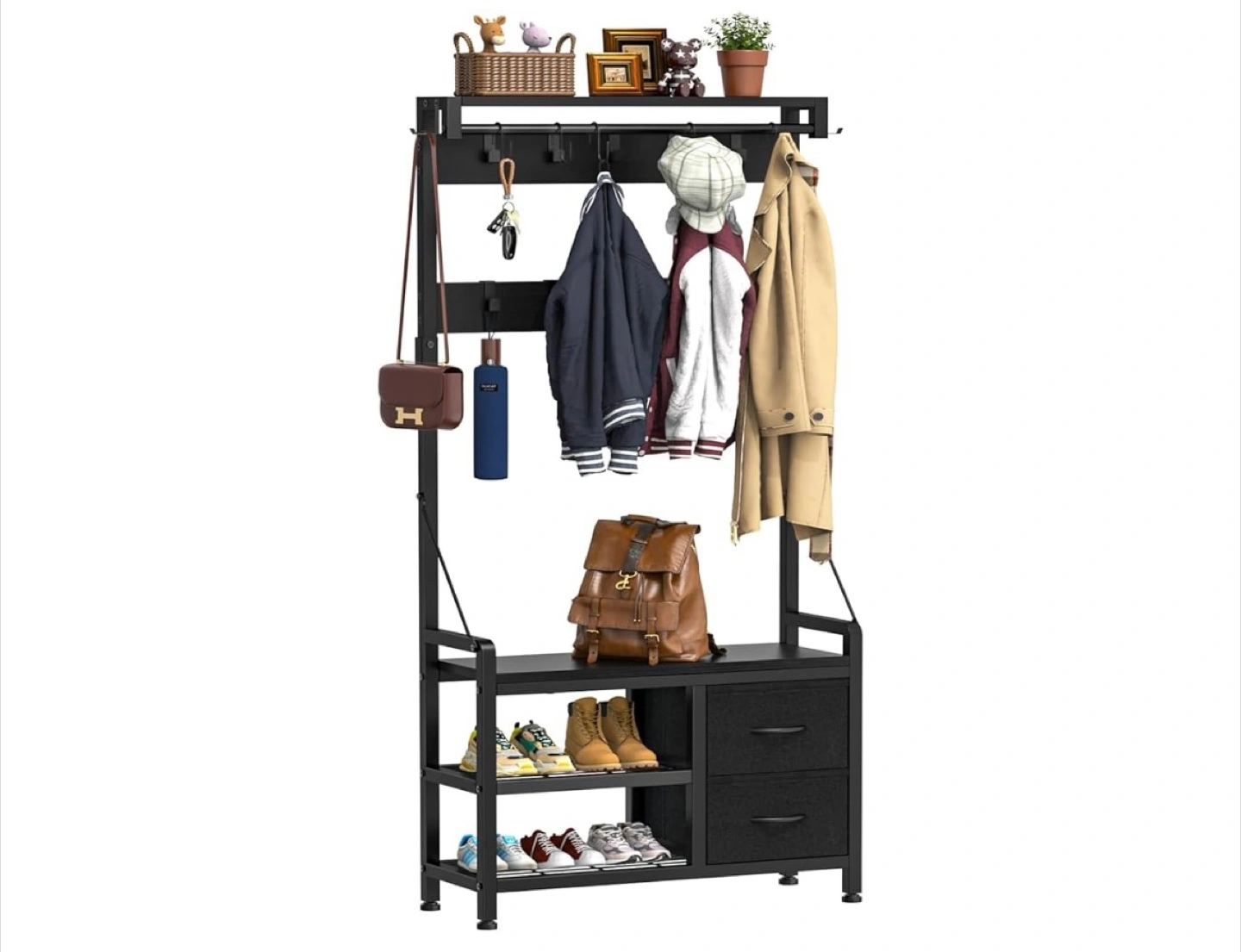 - A top shelf with hooks for hanging coats and bags
