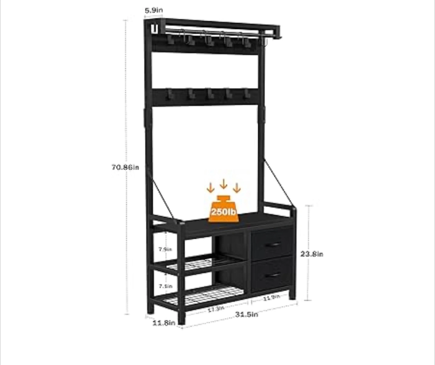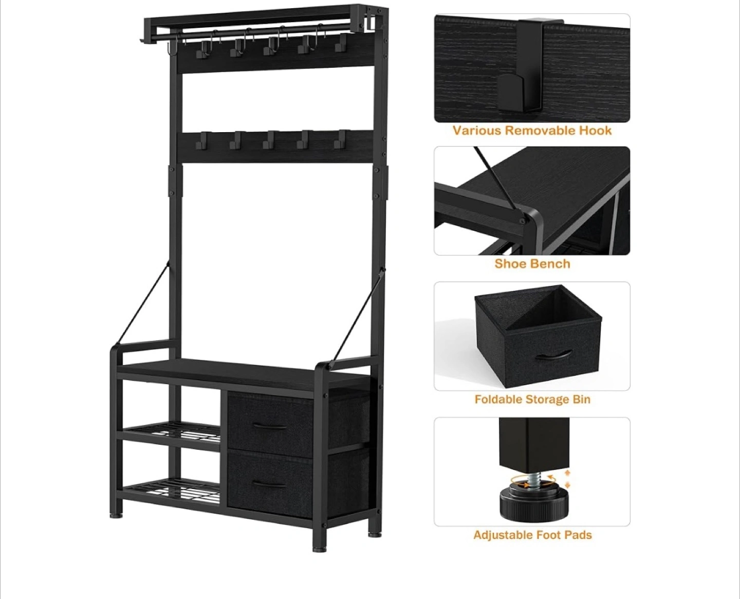 Hall Tree with Bench & Storage - Black